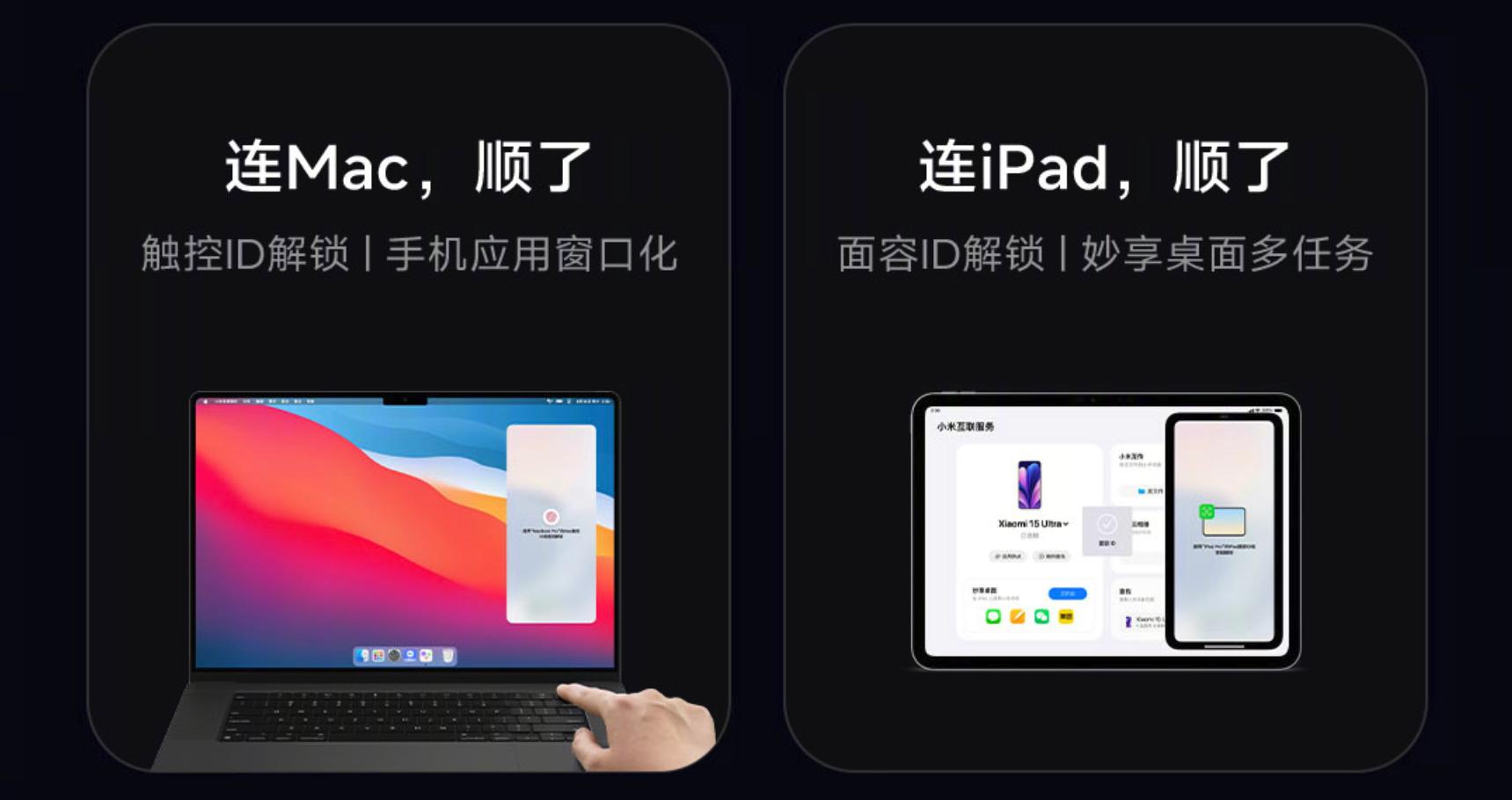 搭载HyperOS 3 的小米手机支持在 Mac 设备上同时开启多个窗口且可调尺寸,同时也支持一键全屏;在 Mac 设备上,用户若想解锁打开妙享桌面的手机,不用拿起手机,通过触控 ID 就可以完成解锁。