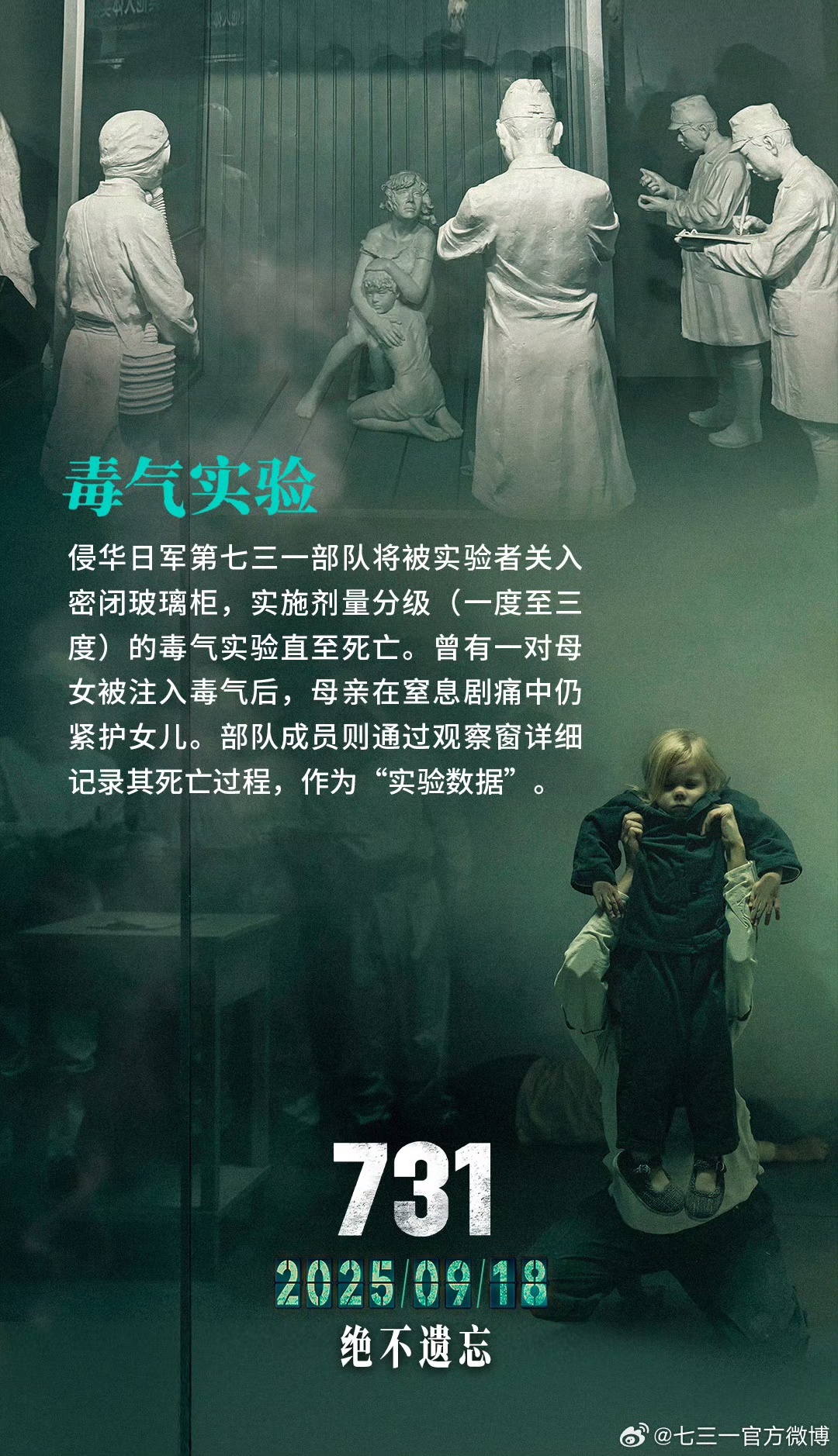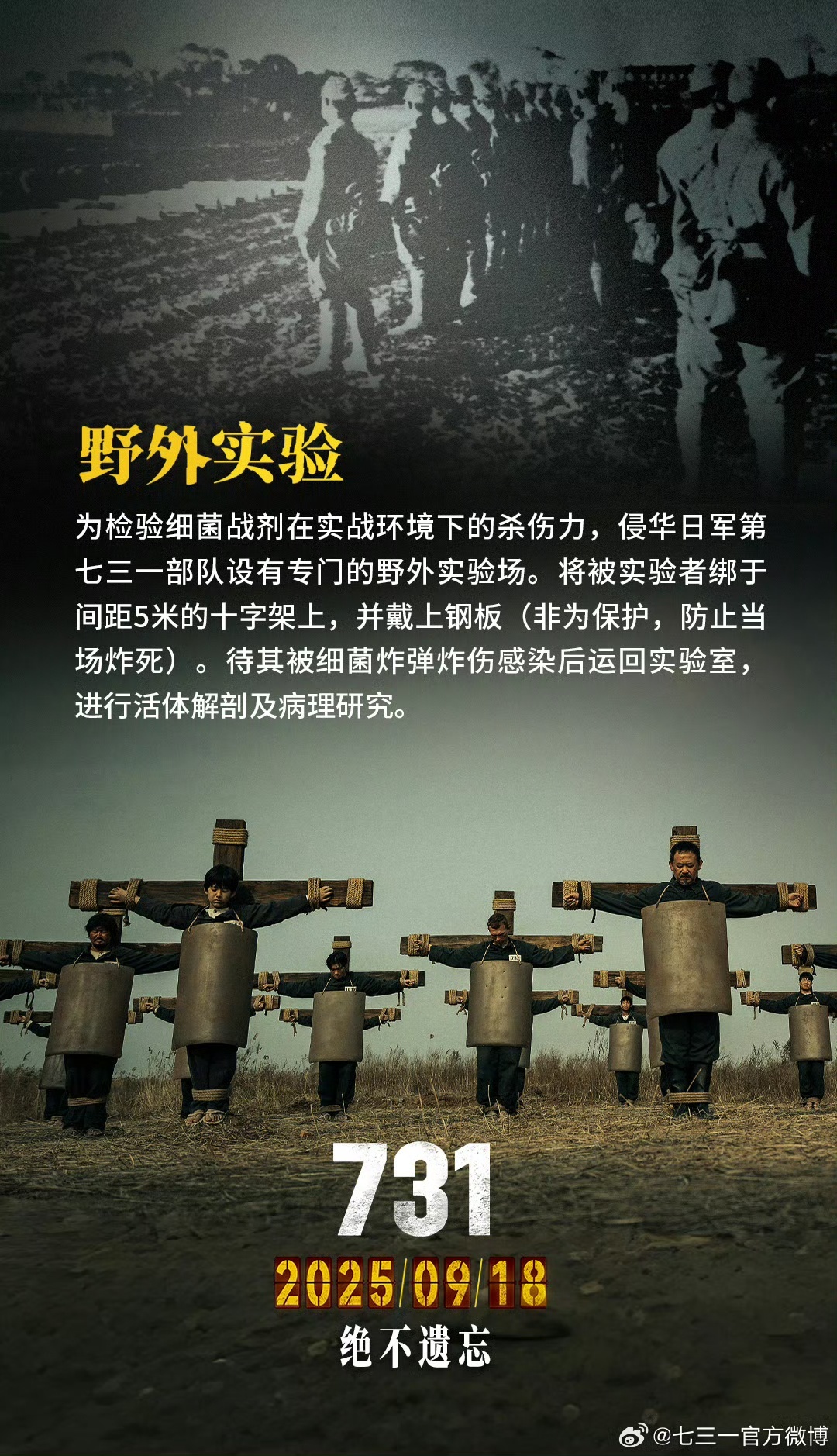 2025年是中国人民抗日战争暨世界反法西斯战争胜利80周年,影片《731》将在“九一八”事变94周年纪念日上映,也让这部电影有了更多的意义。