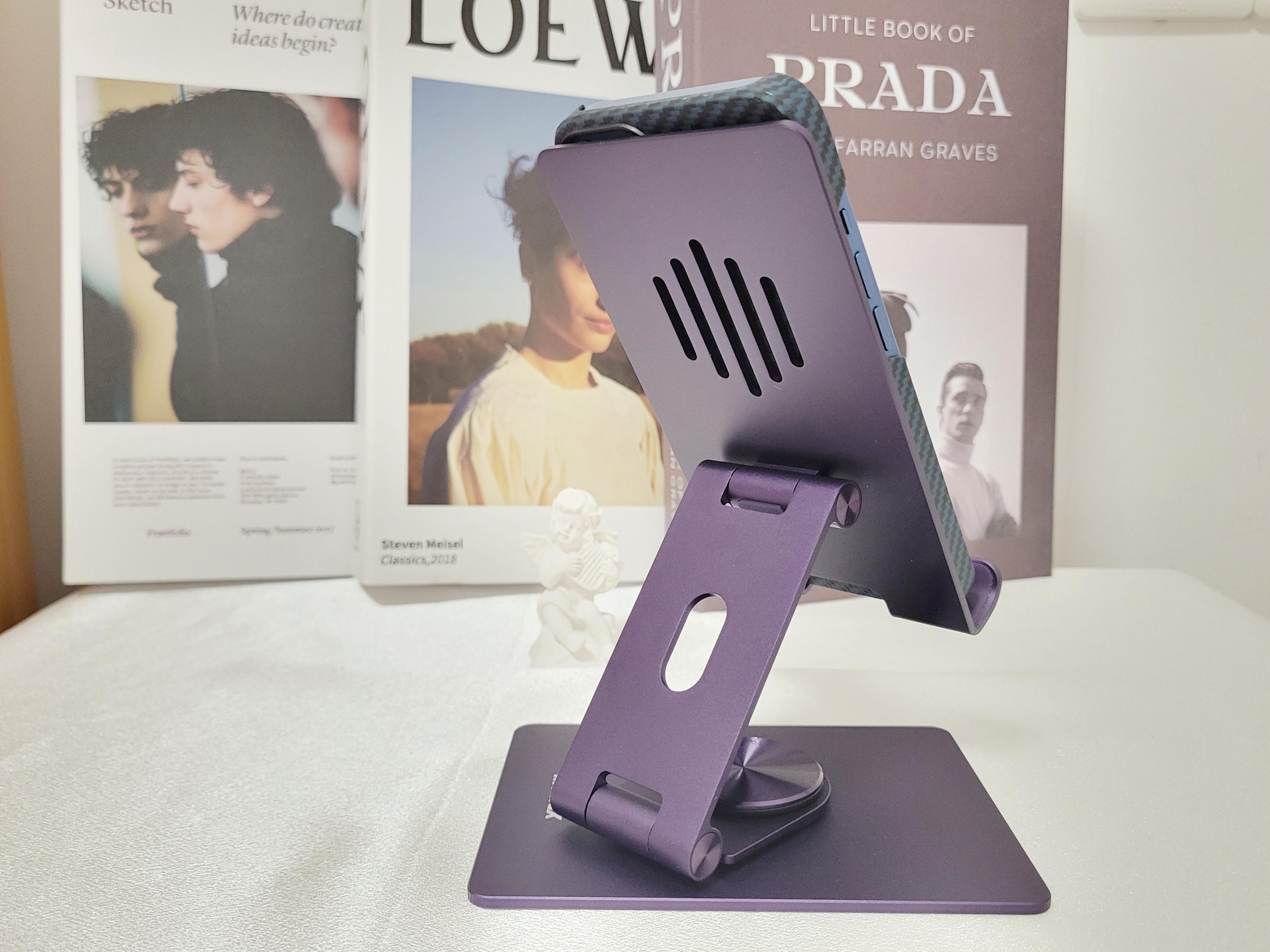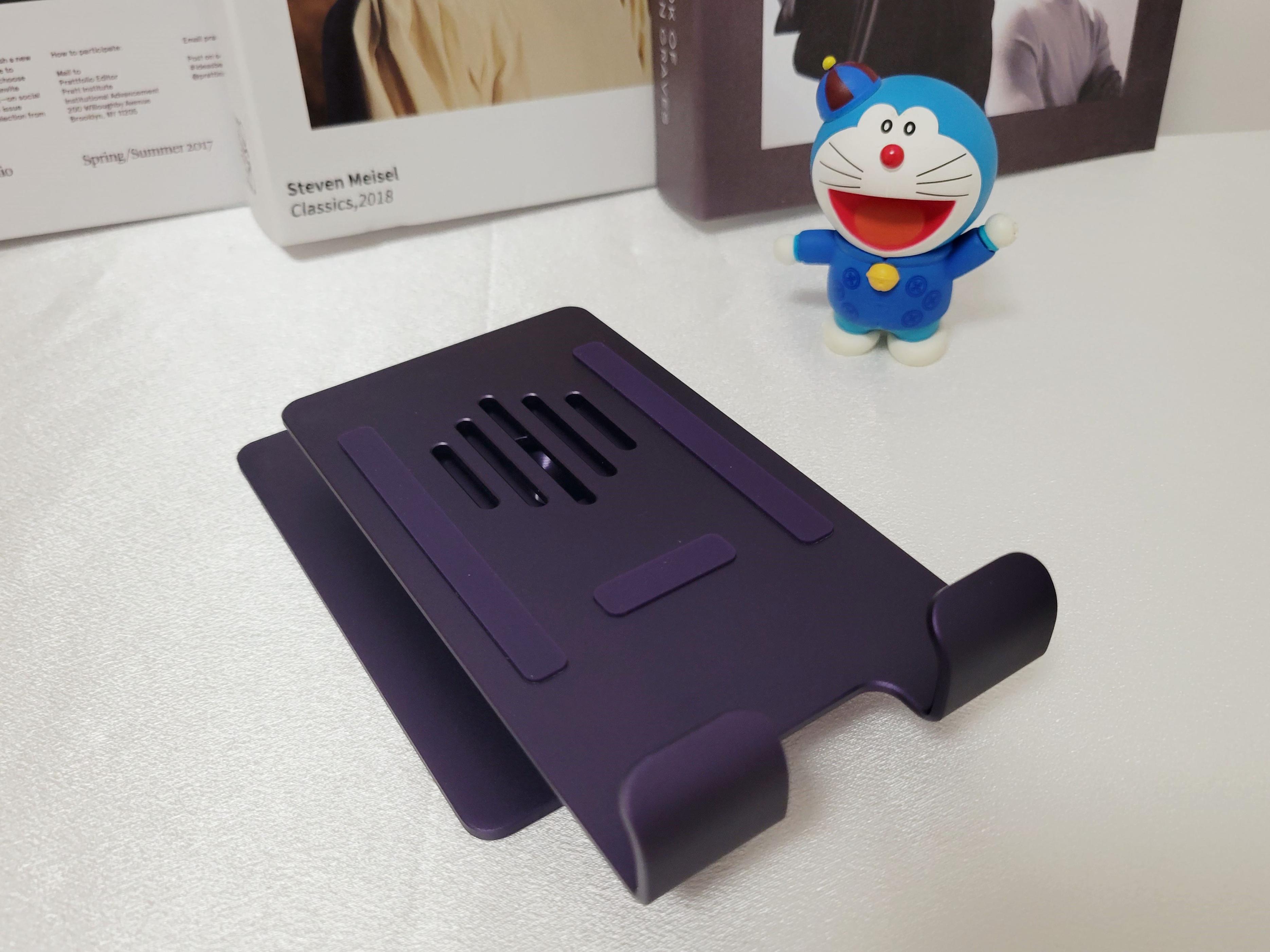 支架背面还设计有散热开孔,面板和凹槽的接触部位都有硅胶保护垫。它的底盘特别稳固,旋转顺滑,全铝合金一体成型,承重高达900g。