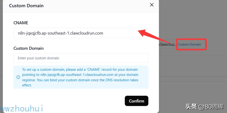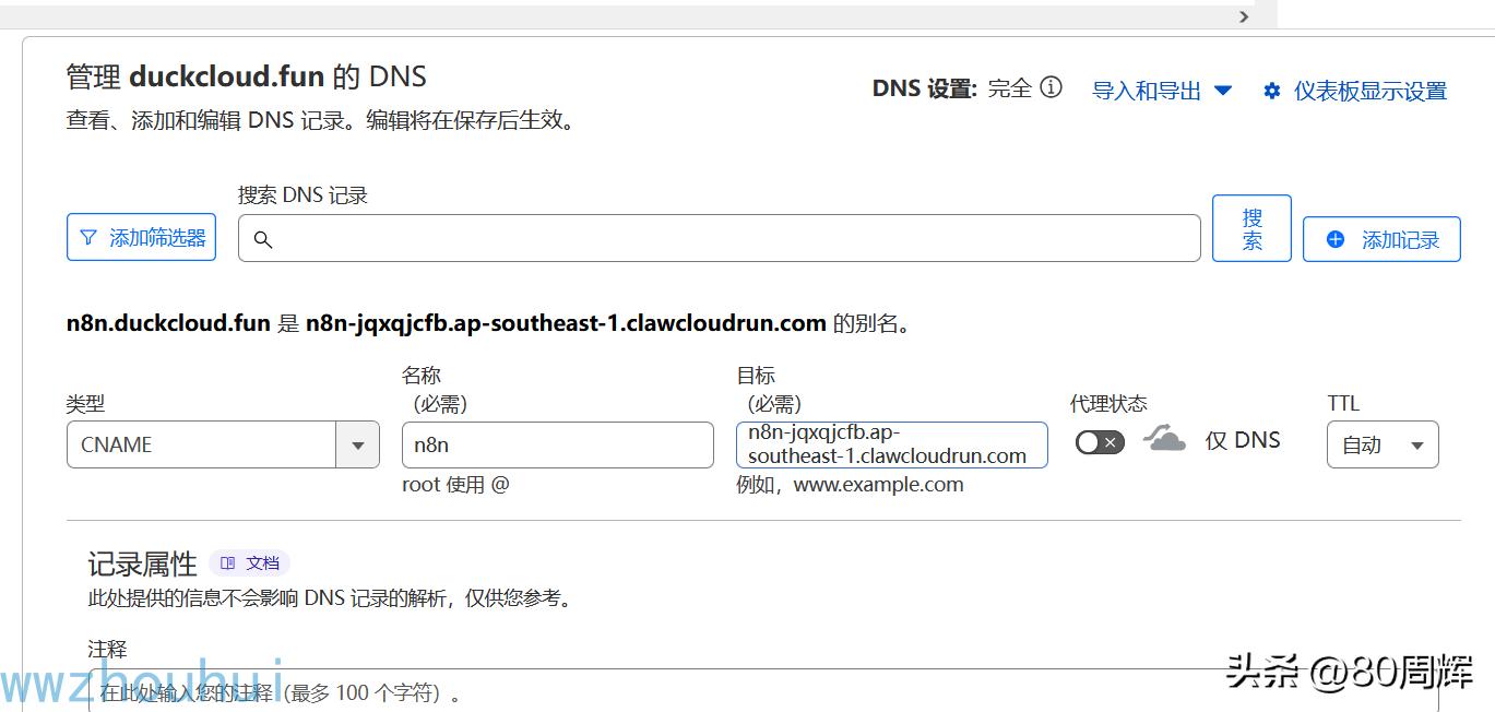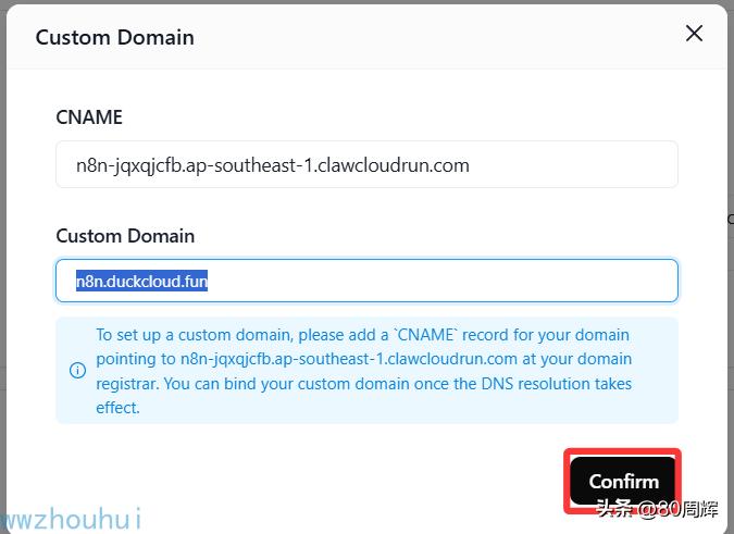 然后在custom domain 添加我们自定义域名“n8n.duckcloud.fun”