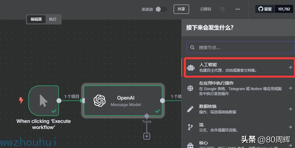 今天主要带大家了解并实现了 N8N 这款开源工作流自动化工具的安装、汉化、使用及免费云部署。该过程涉及多个关键步骤,包括 Docker 安装、汉化插件配置、基本工作流搭建以及抓子云的免费云部署等环节。与传统的工作流自动化方式相比,N8N 不仅支持低代码 / 无代码的方式,使用户能够通过拖拽节点来构建复杂的自动化流程,还具备广泛的集成能力和灵活的扩展性,可以连接不同的应用程序和服务,满足各种自动化需求。此外,N8N 在 GitHub 上已经获得了超过 100K 的点赞,说明其在开源社区中得到了广泛的认可和支持。