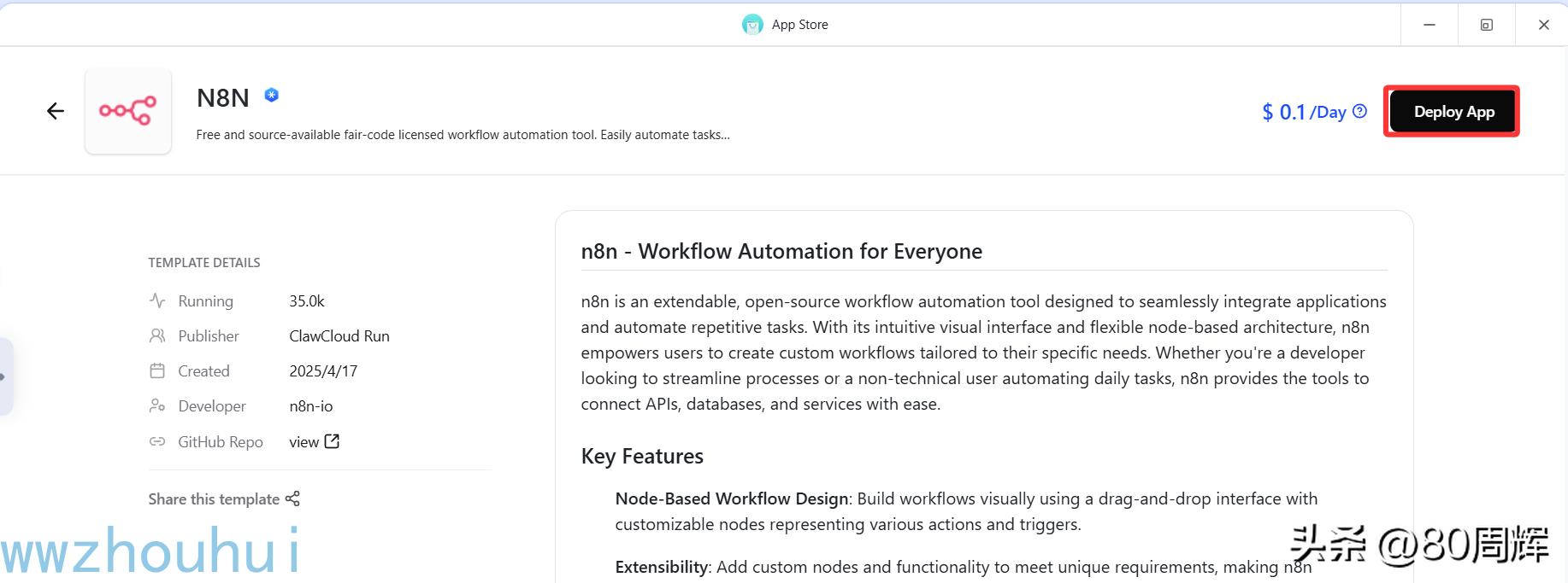 选择app store 直接可以找到N8N软件。选择这个部署是最简单的方式