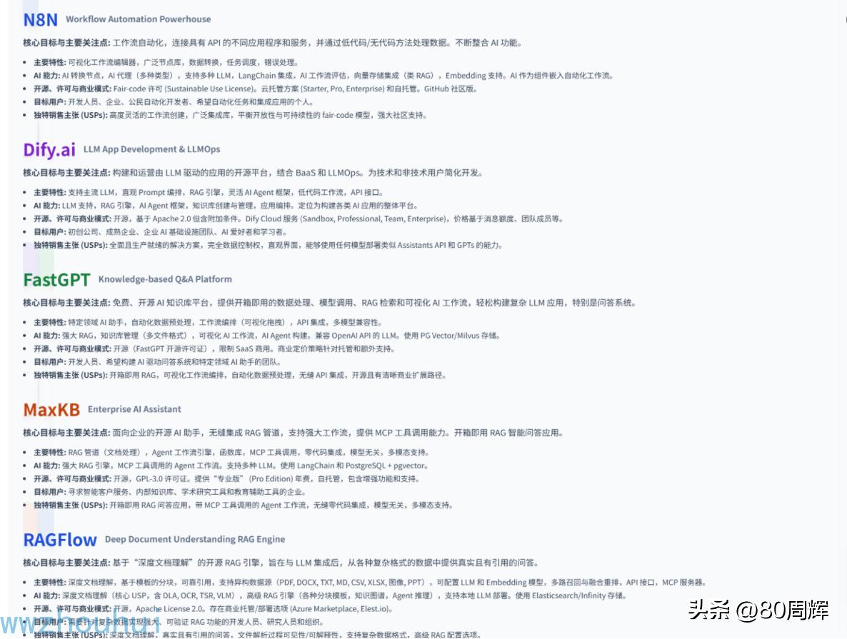 主要 AI 能力 | AI 节点,AI Agent,LLM 支持,LangChain,向量库 (RAG) | LLM 支持,RAG 引擎,AI Agent 框架,知识库 | 强 RAG,知识库,可视化 AI 工作流,AI Agent 构建 | 强 RAG 引擎,Agent 工作流 (MCP 工具),LLM 支持,多模态 | 深度文档理解 RAG,LLM 支持,知识图谱,Agent 推理 |
