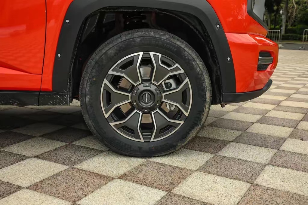 哈弗二代大狗侧面的造型同样和哈弗大狗类似,在前后门板处均加入有切割线条,并且黑色的方形轮眉还配备了铆钉装饰,进一步提升自身的越野风格。前后轮眉线略微向外隆起,又呈现出一定的肌肉感,下方的19英寸战斧轮毂看起来也颇显犀利。