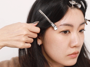 一只手抓住刘海末端,另一只手拉住夹子(不松开状态)往眉尾扯出,形成一个自然的弧形,盖住太阳穴凹陷的地方。