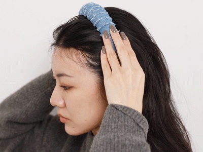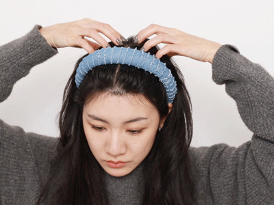 把发箍先插进两耳侧从下往上戴,戴的时候千万不要压紧头皮往后撸,要预留一点点空间,轻轻拂上去就好了。