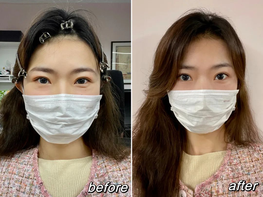这样弄完侧面看头顶是蓬松了,但正面颞区不饱满,显脸大(左下),还要再调整一下才更美(右)。