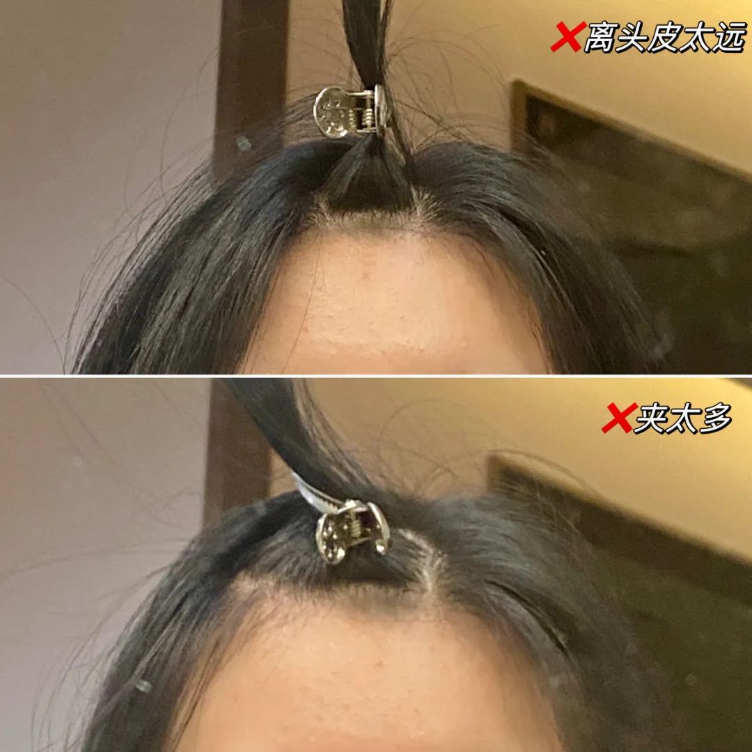 夹子张开时范围尽量小,夹子往后推时就能紧贴头皮~