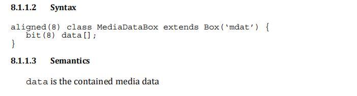 Meida Data Box 媒体数据box 位于顶层,定义是一个字节数组,用来存储媒体数据。该box数量可以为0个,也可以有多个(当媒体数据全部为外部文件引用时),数据直接跟在box type字段后面,具体数据结构的意义需要参考metadata(主要在sample table中描述)。