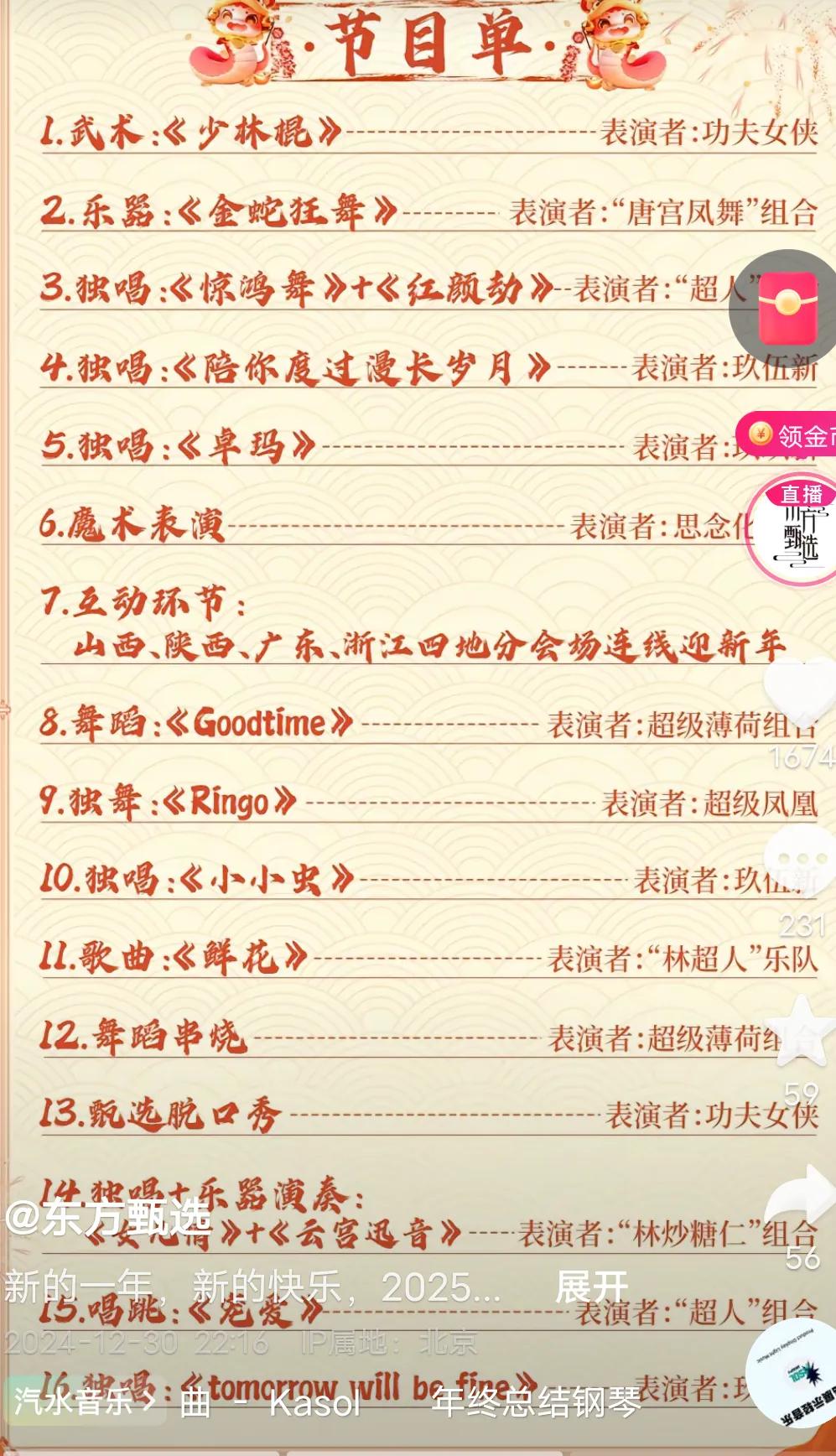 东方甄选也安排了跨年演出。提前放出的节目单看着也很热闹。