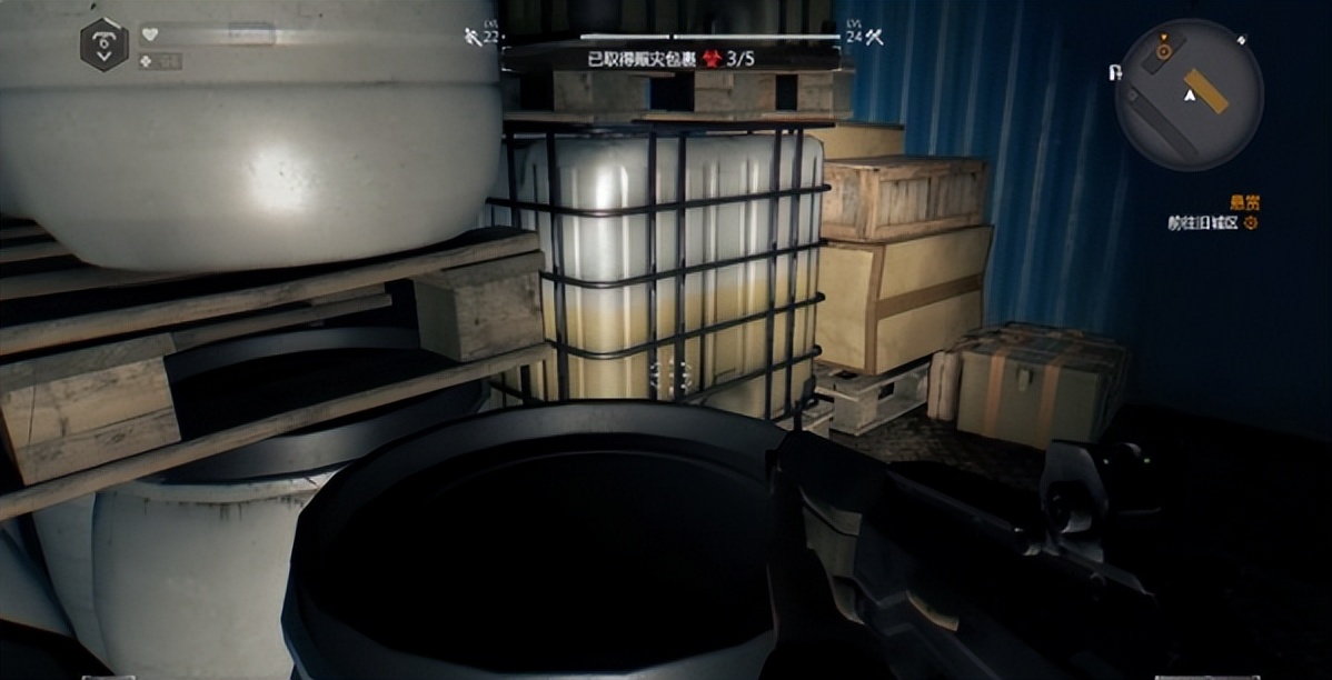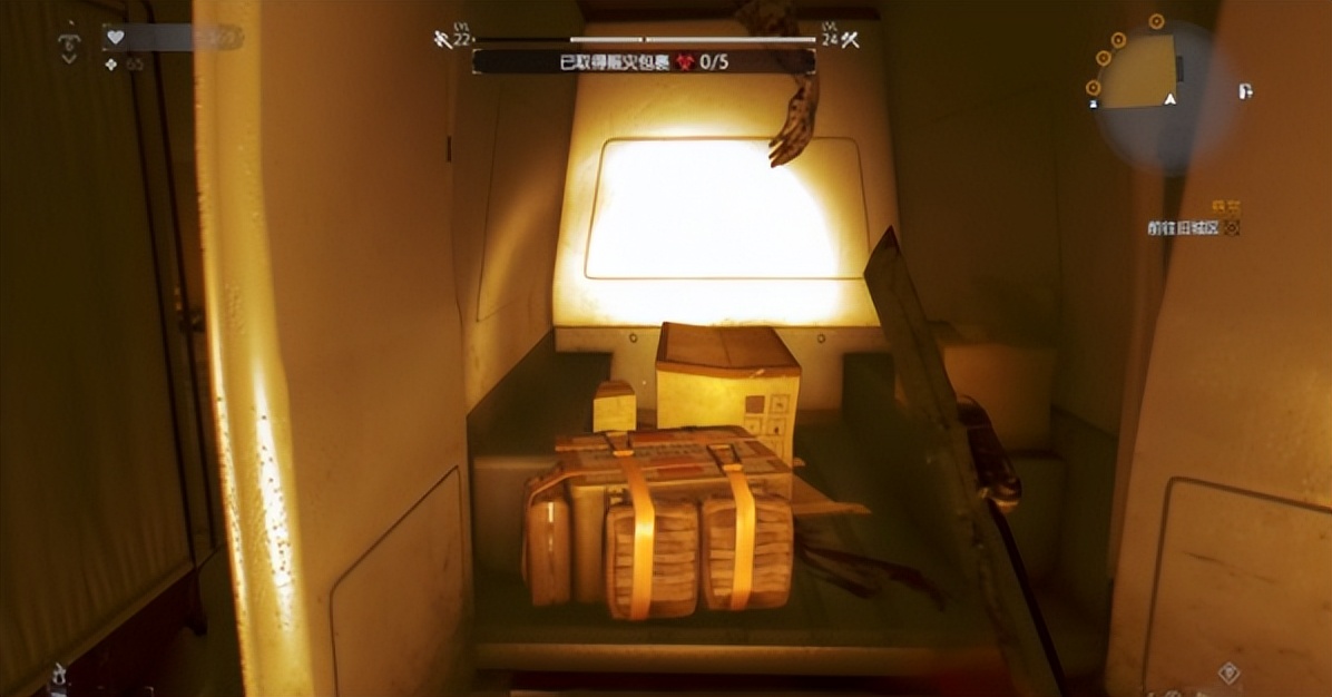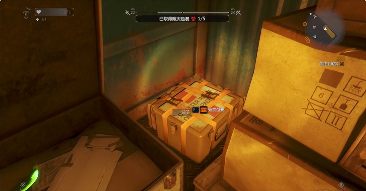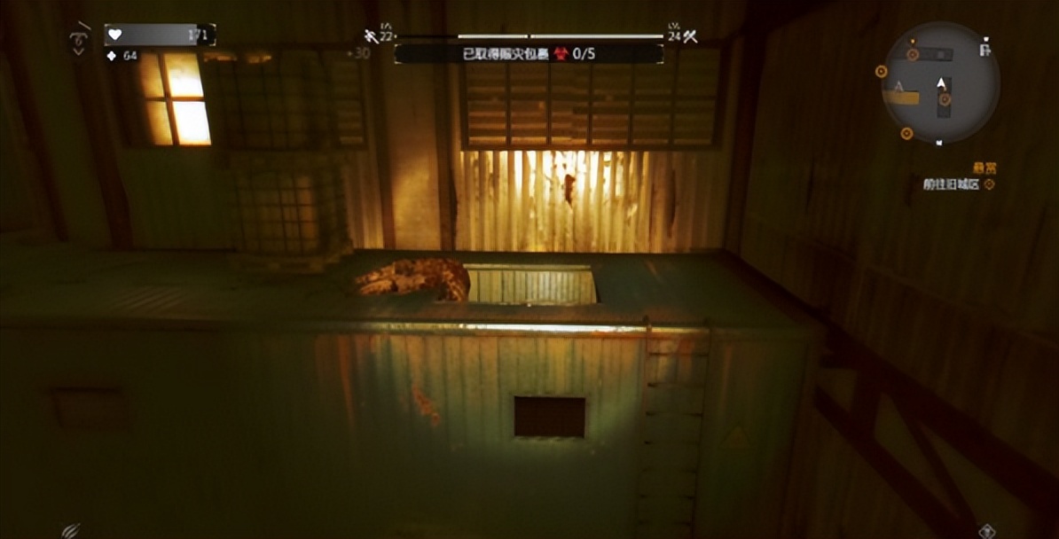 1.依旧从右侧蓝色集装箱攀爬而上,第一个赈灾包在对面集装箱顶部入口的舱内尽头,有一只普通感染者看守。