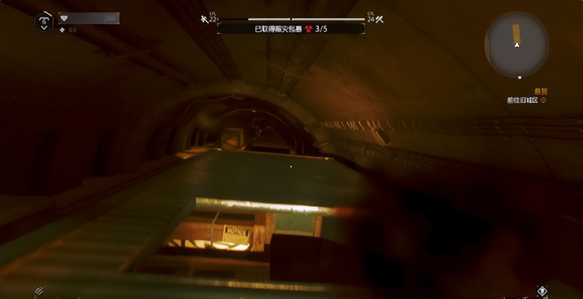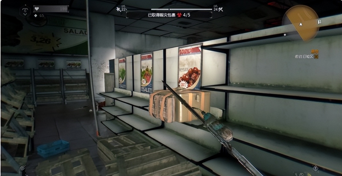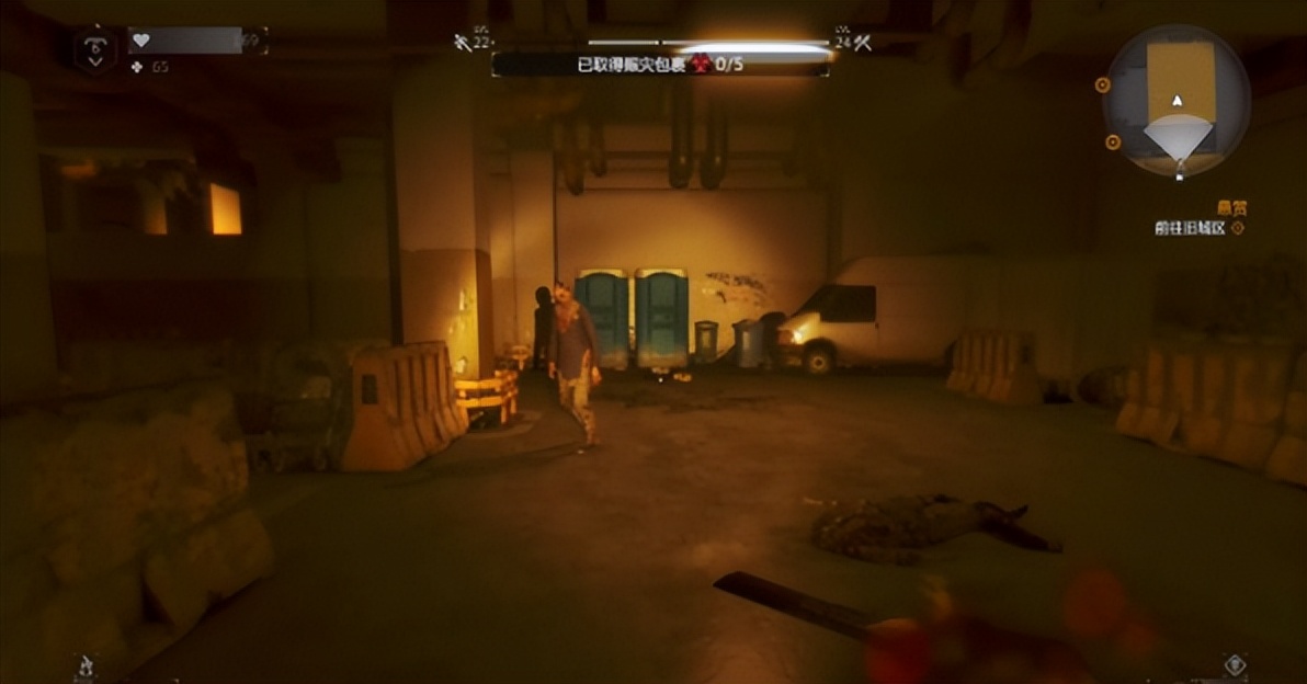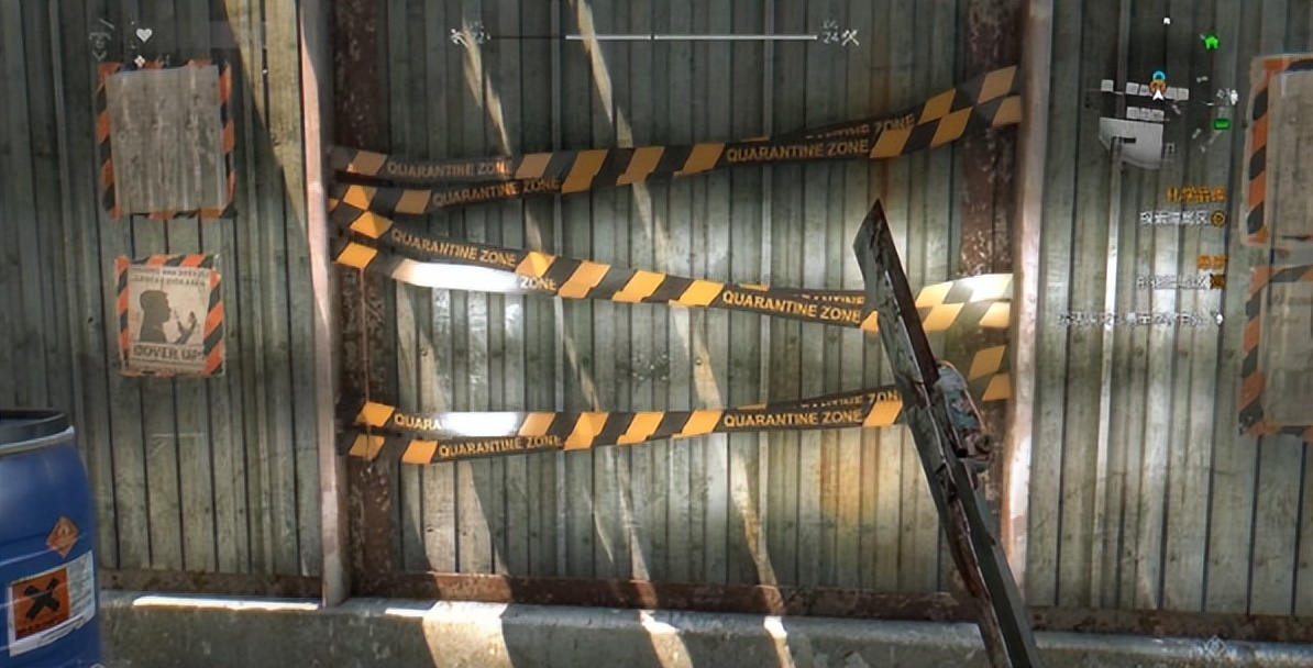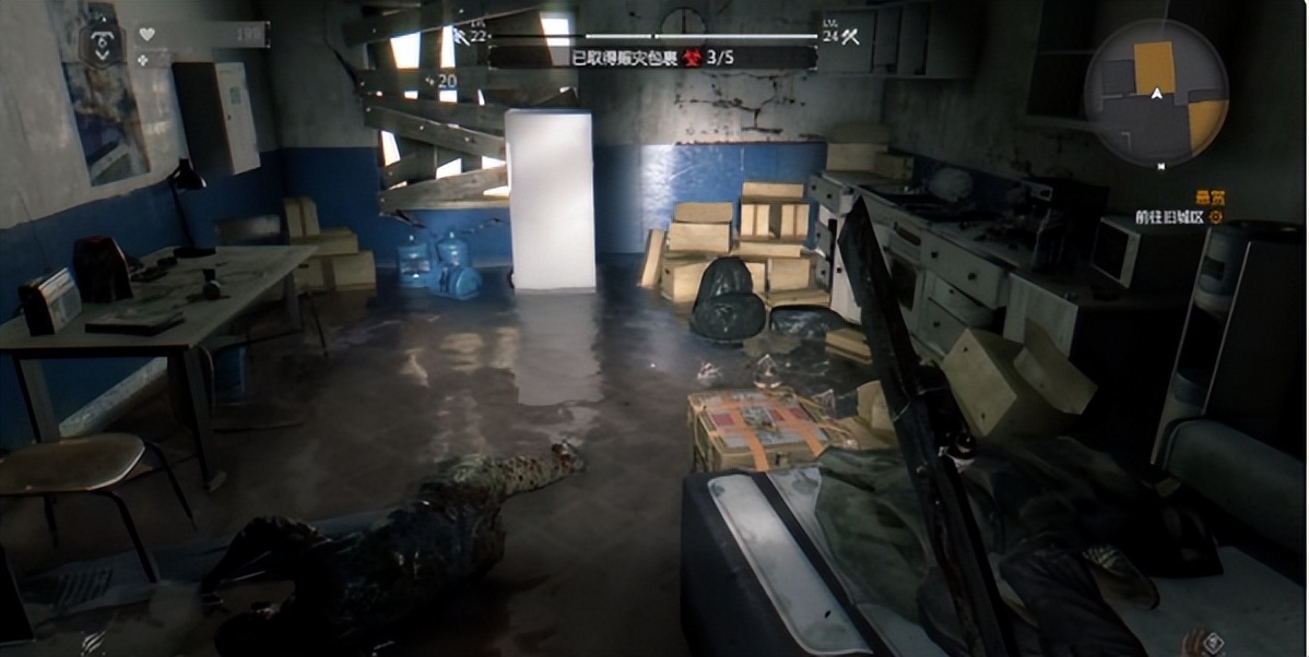 1.依旧从右侧蓝色集装箱攀爬而上,第一个赈灾包在对面集装箱顶部入口的舱内尽头,有一只普通感染者看守。