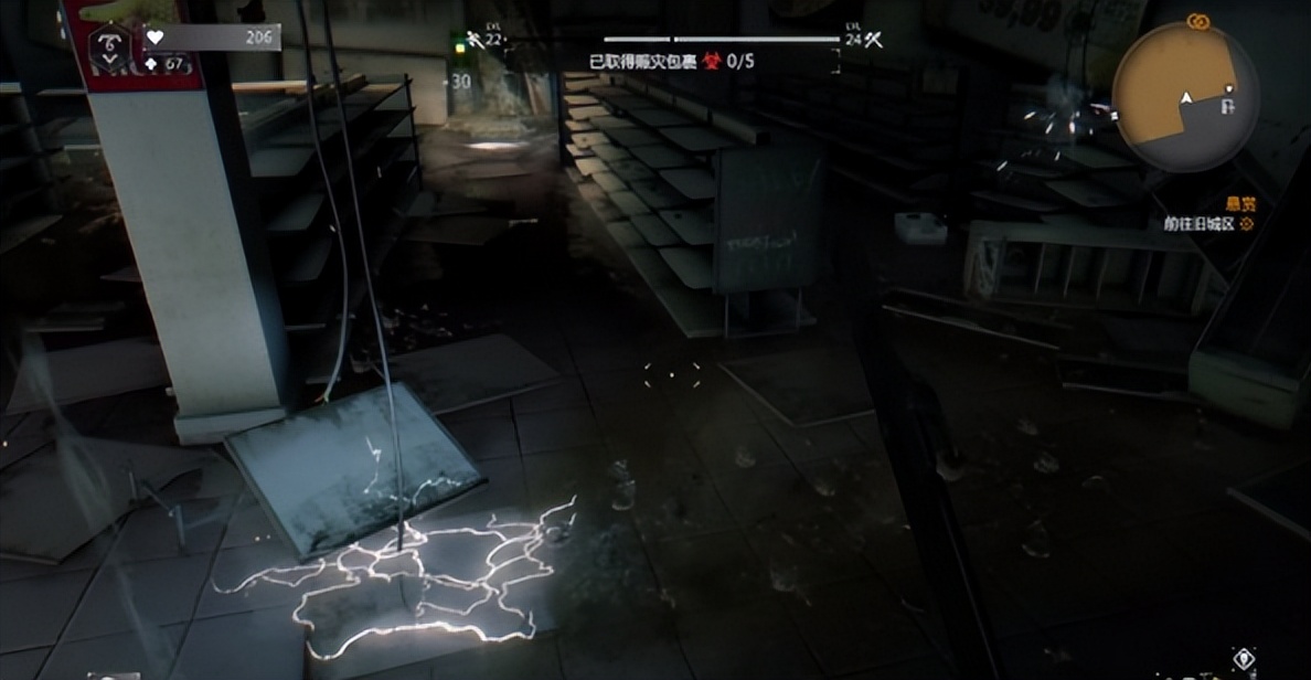 1.进入超市,沿右上方墙体爬入超市内部。环顾四周后,映入眼帘的是一大片积水和裸露电线融合而成的漏电区域,我们选择从靠右手边的边缘地带贴边行走,关闭电闸。(万不可以身试法,水流电伤害很高,几秒钟便让人一命呜呼)