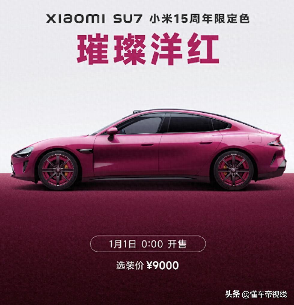 今年1月1日,小米SU7推出全新璀璨洋红车身颜色供选装,选装价格为9000元。此外,小米SU7 15周年限定系列同步推出,提供4款新轮辋以及1款新内饰。其中,小米SU7璀璨洋红提供专属20英寸米型轮辋,细节加入璀璨洋红配色;小米SU7全系可选20英寸米型轮辋。此外,小米SU7全系可选20英寸花瓣低风阻轮辋,选装价格6000元;小米SU7 Max版可选21英寸金属钕色运动轮辋,选装价格为13000元。