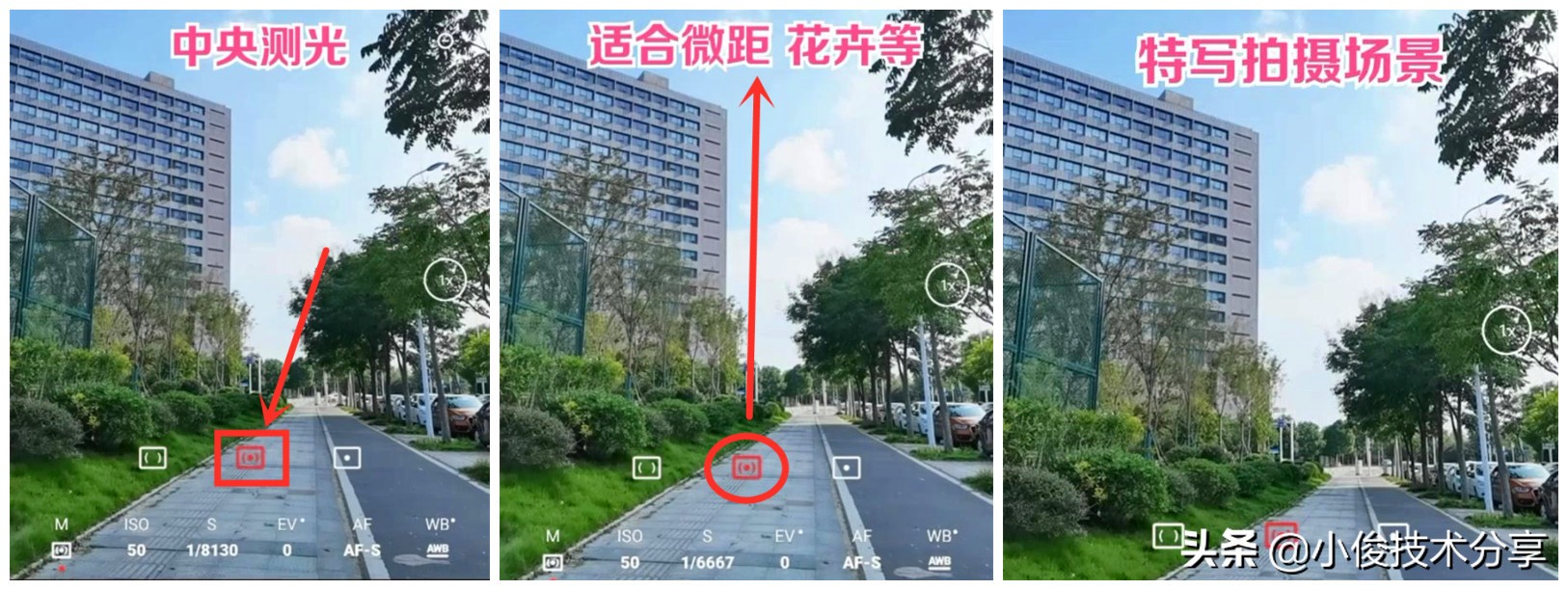 接着点击中间图标,这个图标表示的是中央测光,那么这个模式适合什么拍摄呢?如果你拍摄的是花花草草,或者需要对某个物体进行特写,那么就选择这个中央测光模式拍摄,这个模式适合微距拍摄,特写场景拍摄!