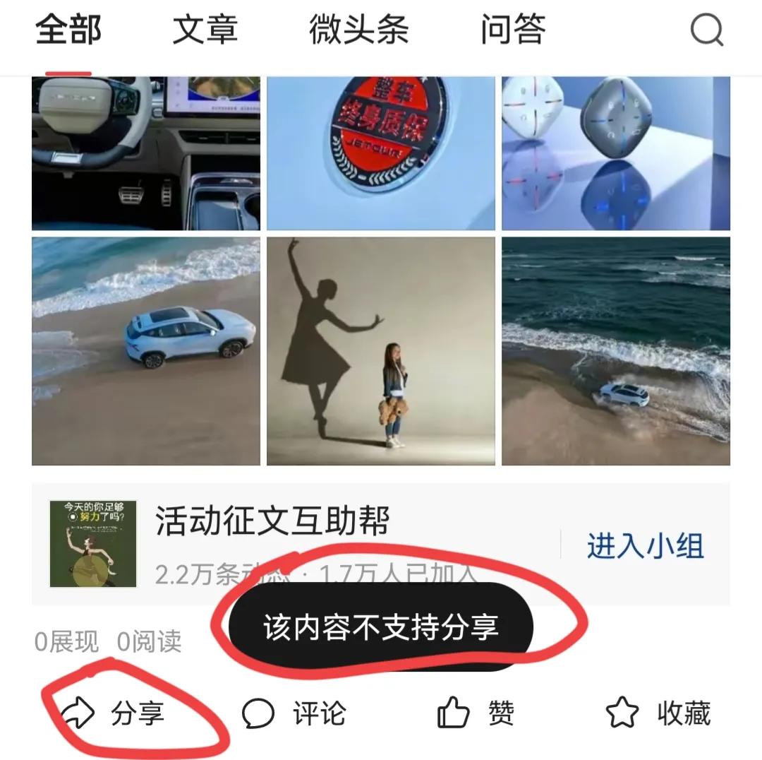 比如下图这样的,点分享的时候显示“该内容不支持分享”,就是违规限流了。这种处罚都是悄悄进行的,充满神秘感(不会收到系统通知),不仔细去发掘的话是发现不了的。