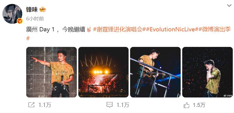 9月19日至21日,谢霆锋在广州大学城体育中心体育场开唱——举办“Evolution Nic Live 谢霆锋进化演唱会”广州站,本次巡回演唱会是谢霆锋时隔20年再开个人线下演唱会。