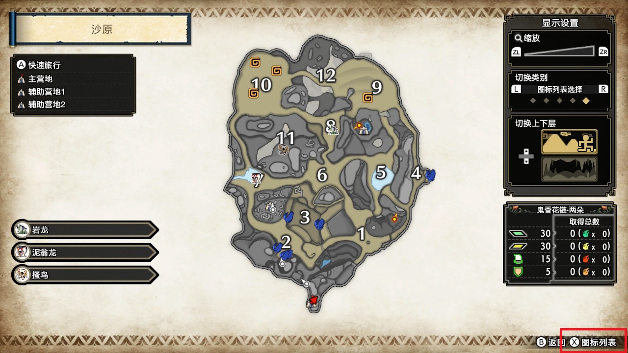 本作地图也和前作类似,在地图上标注了所有采集点、环境生物以及特产等,我们可以在任务中呼出快捷环,选择5点钟位置的地图。进入详细地图之后可以看到右下角可以看到“X图标示例”。
