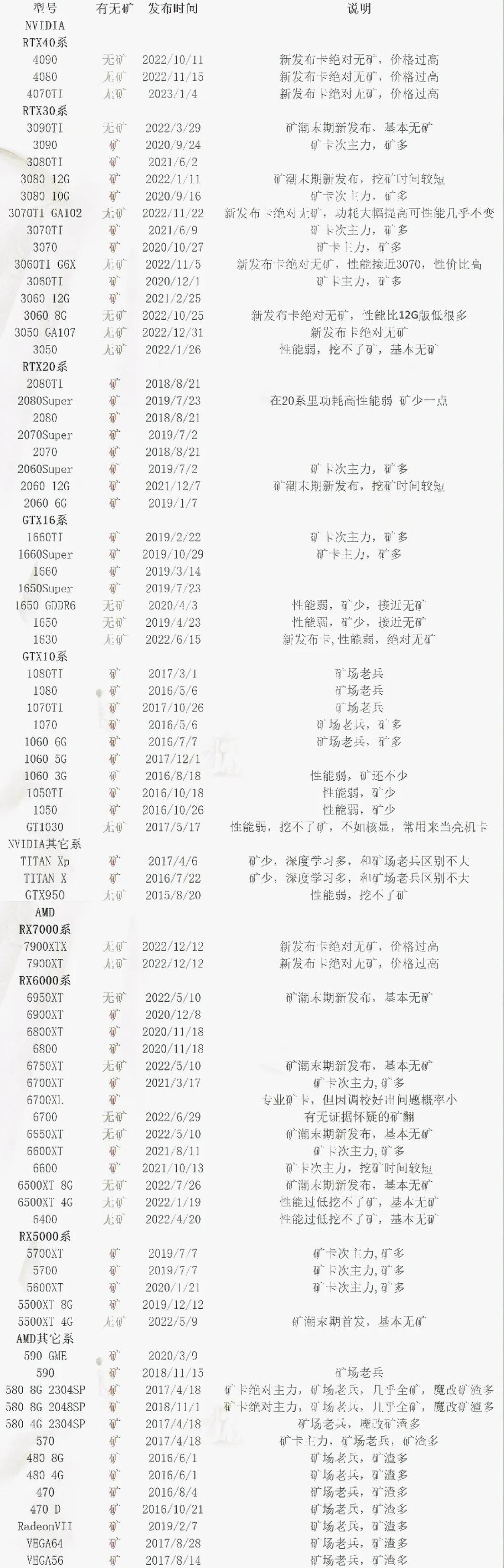 想知道哪些型号的显卡无矿么?更详细的可以直接参考下图。哪些系列显卡无矿或者有矿,更是一目了然!可以直接抄作业保存备用。