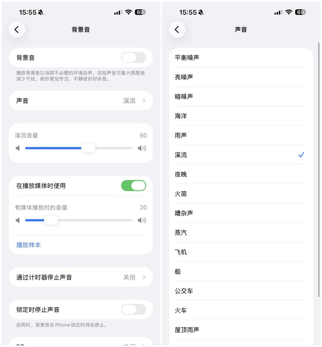 • Apple 在 iOS 26 中添加了多个背景音的声音选项,我们可以在「设置-辅助功能-音频与视觉-背景音」中先启用这项功能,然后通过「声音」选项来从多达 16 种类型的声音中进行选择。