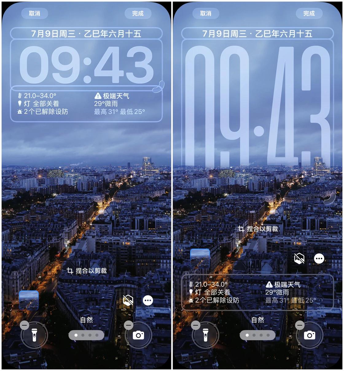 Apple 还为时间组件加入了根据壁纸的内容自动进行变化的特性,比如说你将壁纸设置为随机照片,就可以观察到每次壁纸更换时时钟组件都有所不同,包括字重、自宽和字高都会针对壁纸内容进行适应。