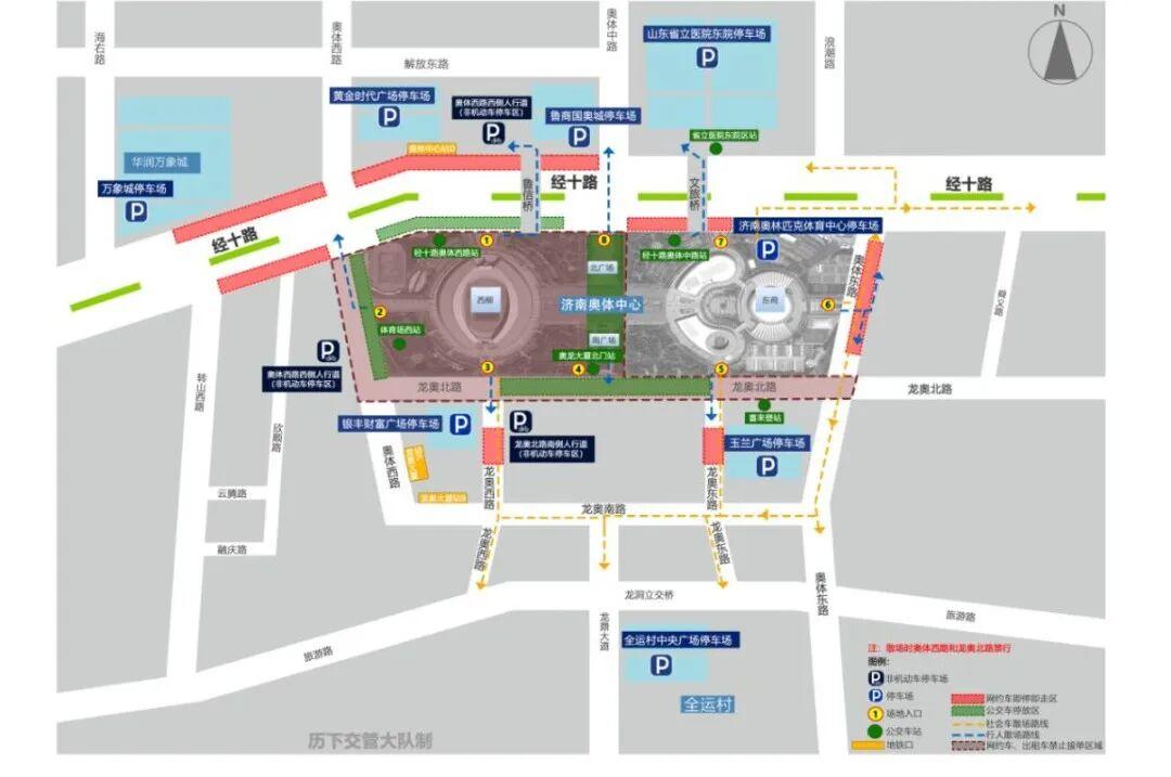 奥体中心周边主干道严禁停车,场馆出入口也不允许车辆排队等候;网约车需到经十路北侧、奥体东路、龙奥西路、龙奥东路的 “即停即走区” 接送客,避免扎堆拥堵。