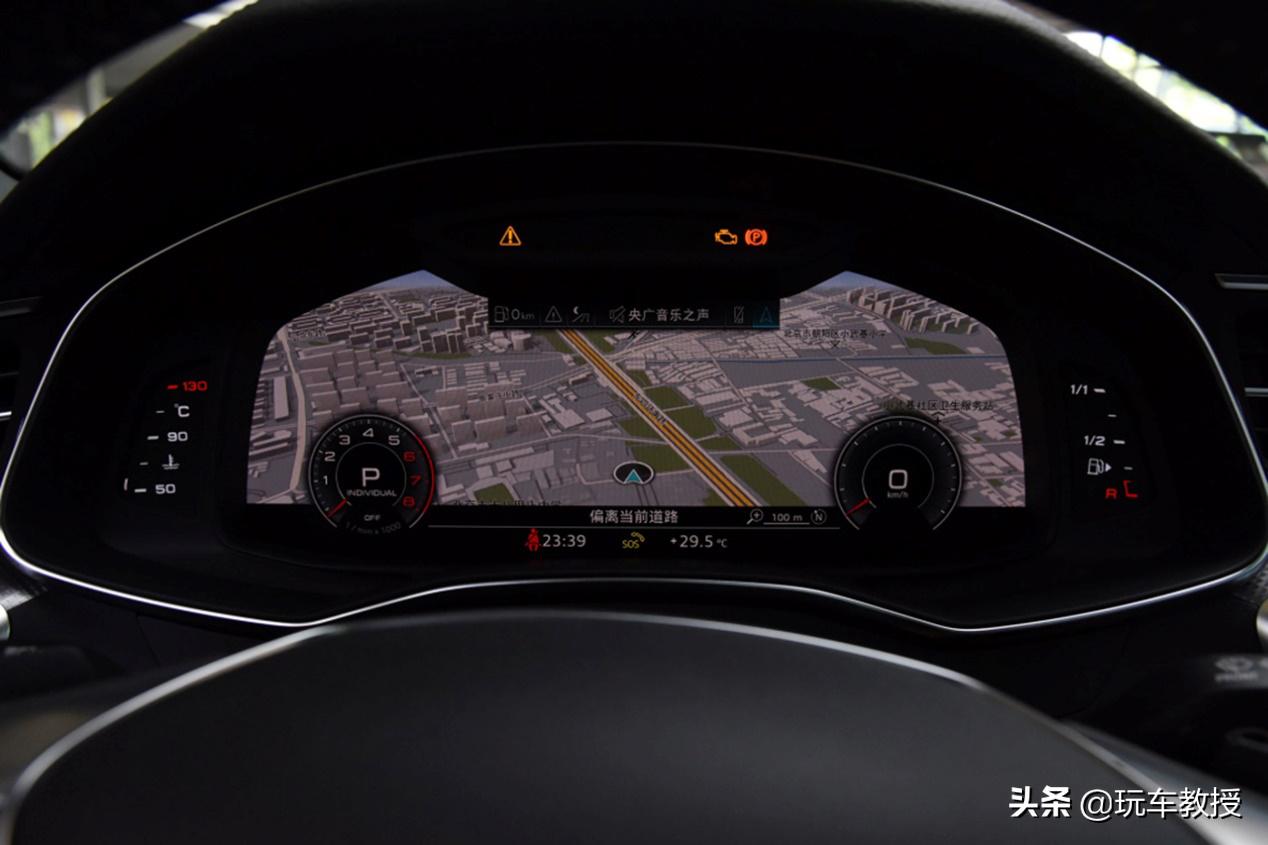 我们拿全新奥迪A6L的全液晶仪表来举例,基础的发动机转速、时速、水温、燃油、驾驶辅助系统等信息被陈列在最前端,一目了然。导航的地图信息可以投影到全液晶仪表盘上,在全屏导航的模式之下,地图变成主视觉,但重要的行车信息依然会得到完善的显示。