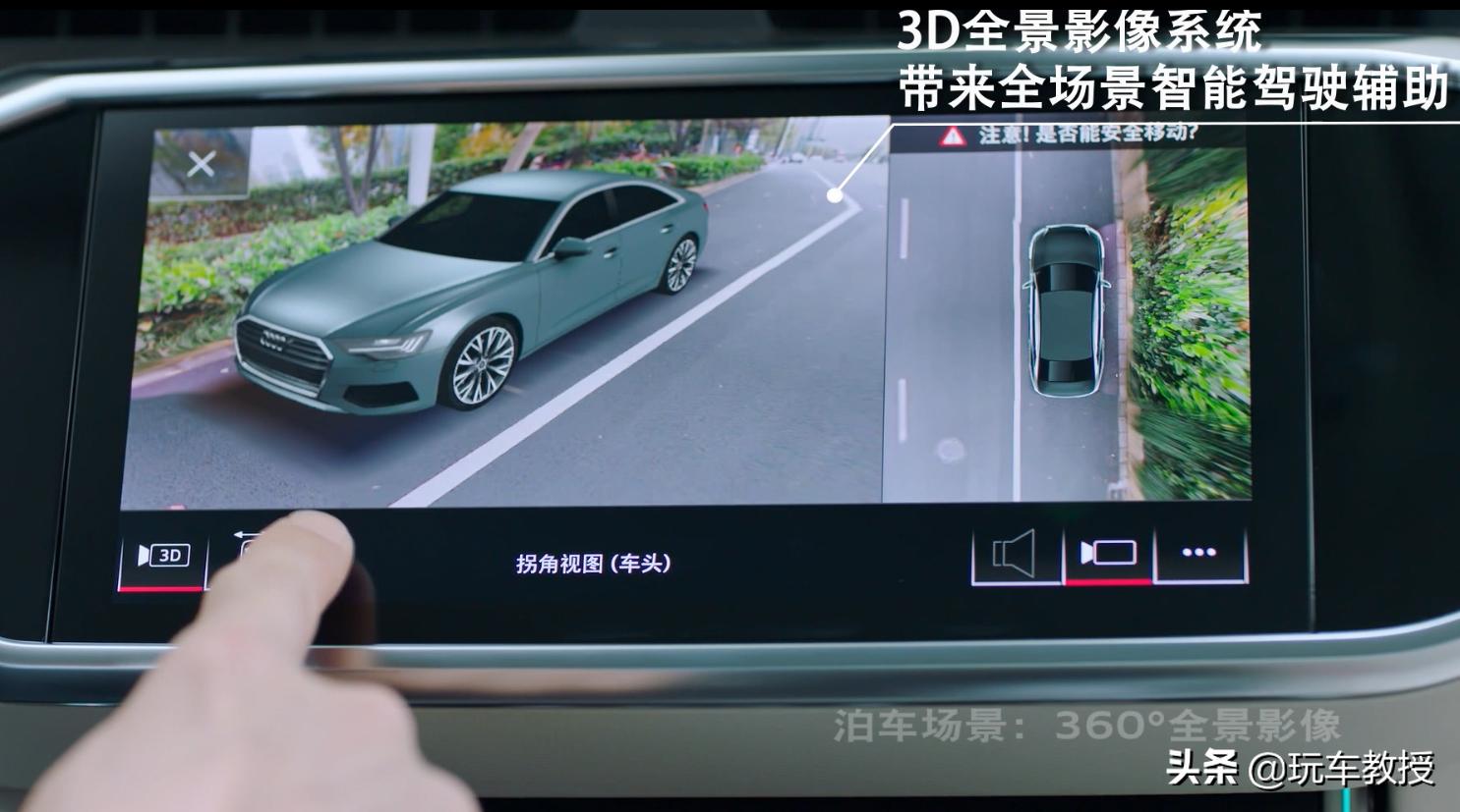 这些硬件基础除了服务各种驾驶辅助系统之外,也针对一些普通功能进行了优化。比如全新奥迪A6L的360°全景影像系统。遍布车身四个角落的摄像头提供图像信息之后,处理器可以模拟拼接出几乎没什么畸变的周边环境,并且暗部细节表现很好,夜晚也可以正常使用。