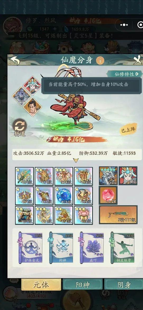 选择修仙修魔后就会额外开两个分身,本体叫元体,分身分别是阳神,阴身。两个分身的装备和灵脉都是从0开始,不共享,其他的灵兽精怪神通法宝座驾都是共享的。也就是说我们可以玩三个不同的流派,或者玩三个不同模式的装备和灵脉搭配。