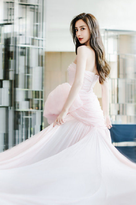 裙摆就是拖地的那种晚礼裙,还是淡淡的粉色调,这样子的裙子,杨颖穿上身完美演绎出它的美,回眸一看,好迷人!