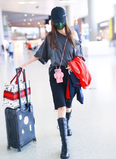 对于杨颖来说,即使是随意穿T恤,都是那么的有范,这件是很普通的灰色T恤,但是采用了斜肩的穿法,把小香肩微露出来,就特别的抢眼,搭配中裤+黑色长靴,又美又帅气哦!