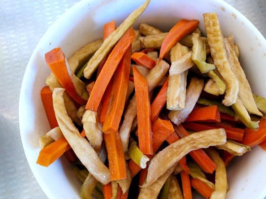 2.把萝卜切成约8毫米粗的条,放太阳下晒