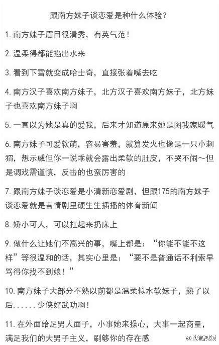 南北地区似乎真的有太多不同了。例如和南北方的女孩,男生谈恋爱是种什么样的体验?