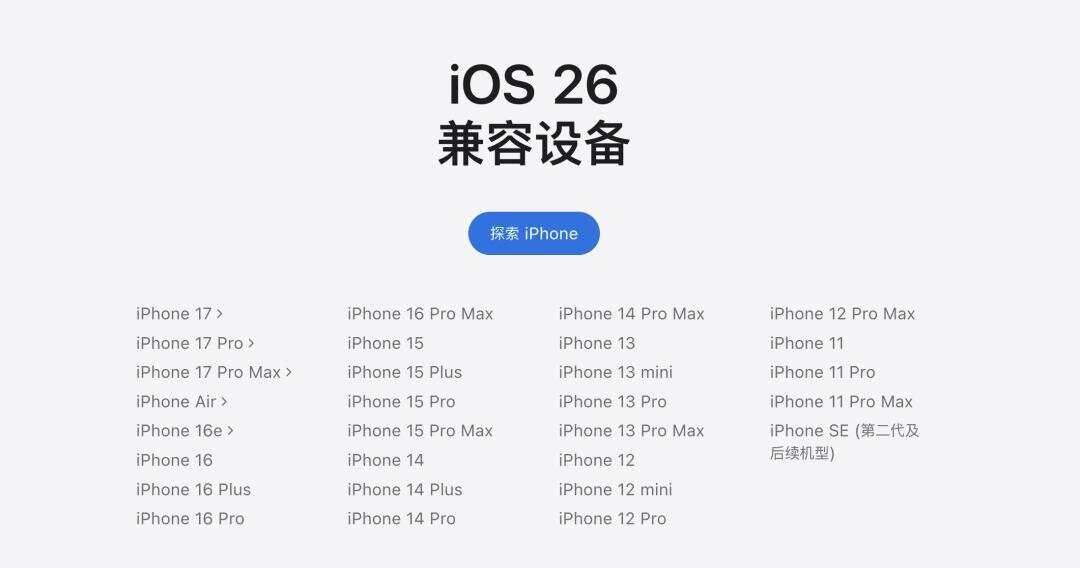兼容性上,iOS 26适配第二代iPhone SE及之后的所有机型,共25款,最新的iPhone 17系列和iPhone Air出厂预装iOS 26。