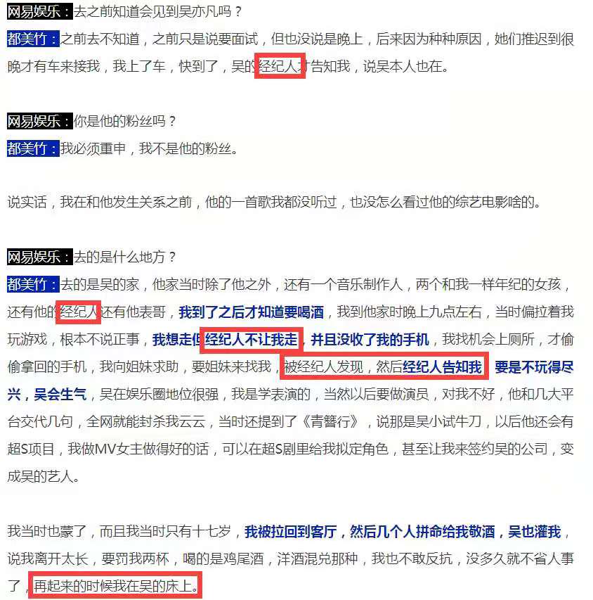 根据都美竹的爆料,自己喝酒被灌醉后再次醒来已经在吴亦凡的床上了,当时就想逃跑的都美竹一出门就看到了吴亦凡的表哥在客厅睡觉,以防都美竹报警。小吕同学也曝出吴亦凡的表哥吴林会亲自面试女孩,这次十年的站姐也曝出关于被吴林偷拍的消息,大概因为身边有吴林,难怪吴亦凡会丝毫不知收敛还越来越大胆。