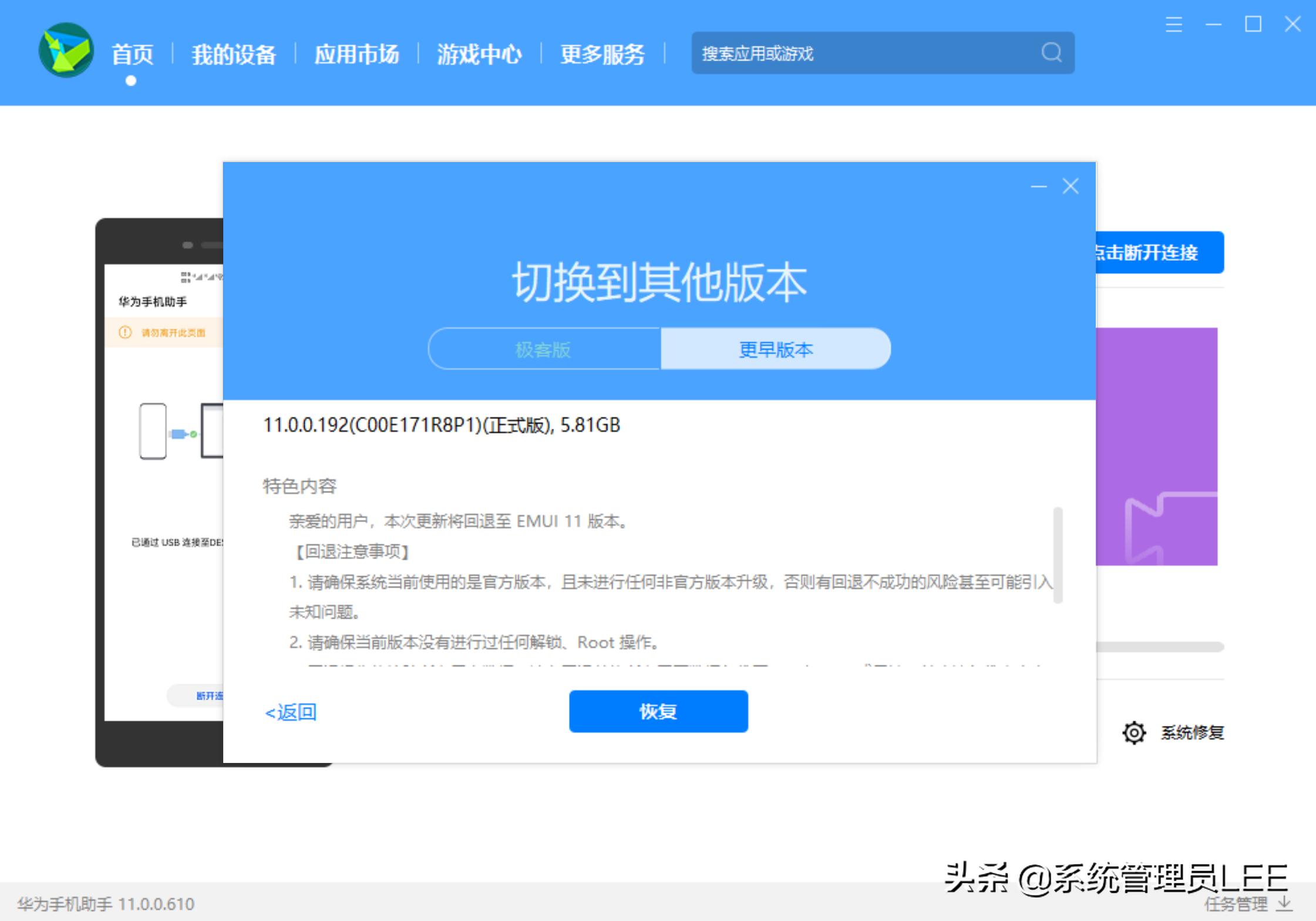 开始操作之前我们要特别注意;鸿蒙系统回退到上一个版本,会删除手机中的所有个人数据,请大家提前备份手机中的所有资料,避免数据丢失造成重大损失。
