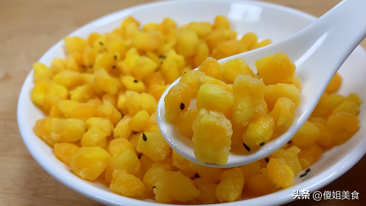 4️⃣ 油炸温度计:油温六成热(筷子插入冒小泡)调中火,玉米粒像天女散花般撒入锅中。一定要用漏勺轻轻推散,炸到颗粒分明就可以捞出了。