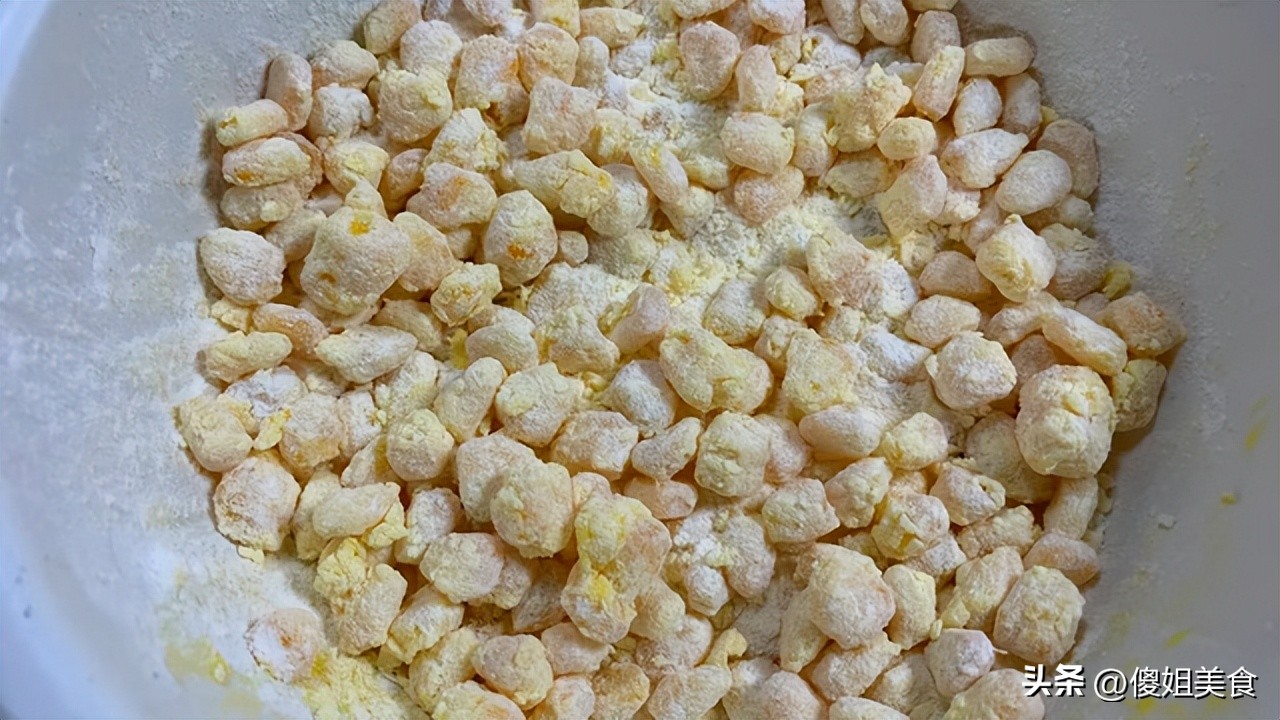3️⃣ 双粉黄金甲:玉米淀粉+糯米粉按3:1混合(加糯米粉更酥脆!)。把玉米粒倒进保鲜袋,撒入粉后shake shake摇匀,保证每颗都裹上"雪花被"。