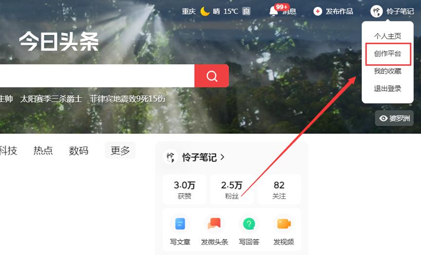 我们的头条账号成功登录之后,接下来可以把鼠标放在自己屏幕右上角的头像上,我们就可以看到“创作平台”,点击进入就可以了。