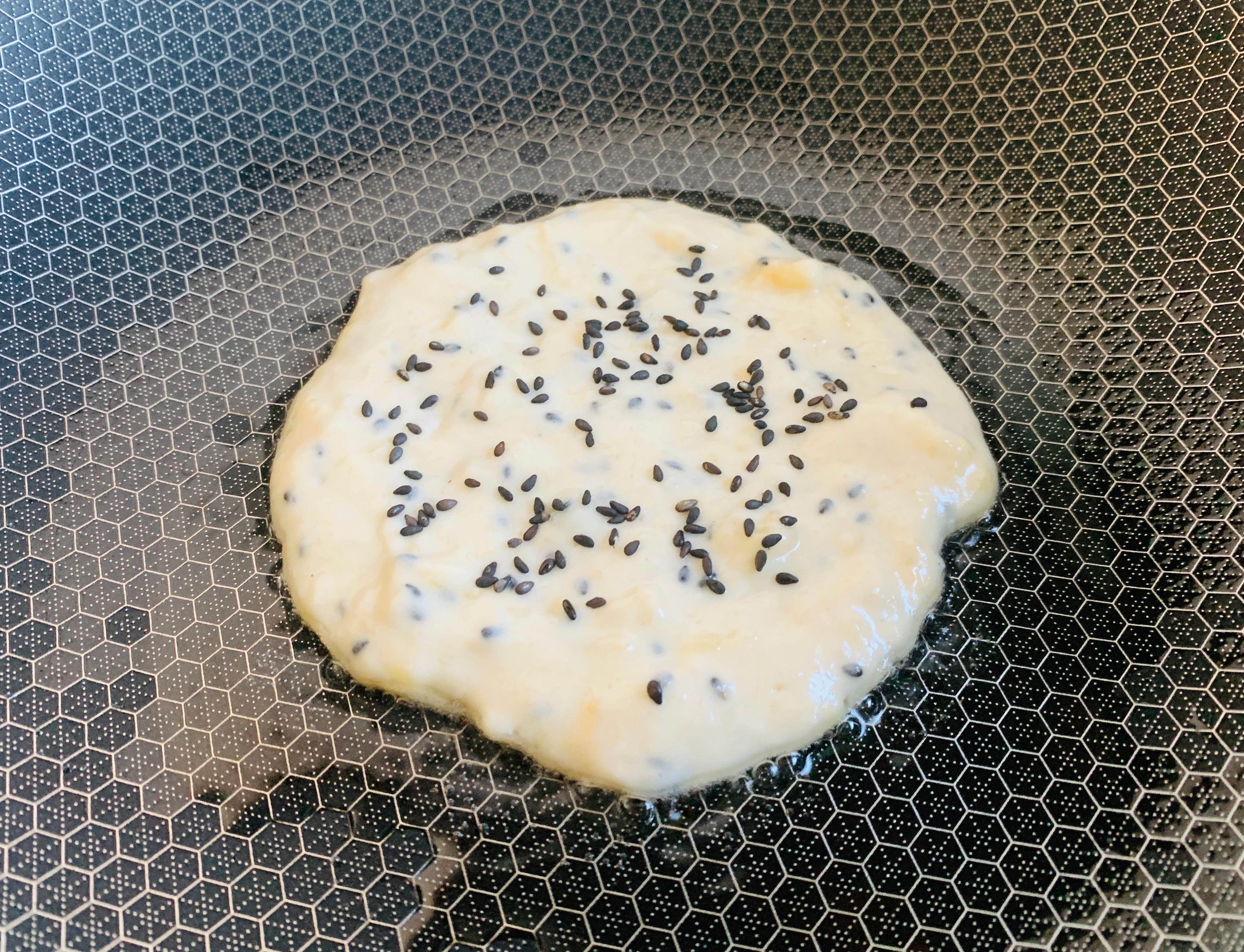 5、平底锅加热,刷少量植物油,舀一勺面糊倒入锅中,用勺子背面轻轻摊薄、摊圆,表面再撒入少许黑芝麻。便于熟的快,我们盖上锅盖,小火烙,一分钟左右翻个面,等小饼按压能回弹就说明熟了。