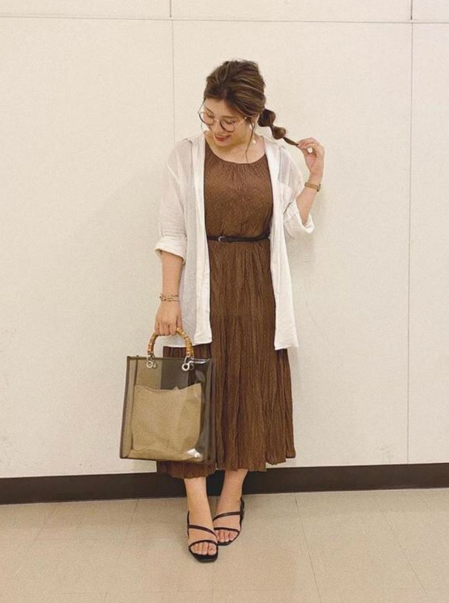 在挑选连衣裙的时候,长度要过膝盖,这样可以遮住你的粗腿和肌肉腿,仅仅露出一点脚踝再搭配上凉鞋,看上去会更加舒爽优雅,而开衫在这个时候,就能达到一个很好的显瘦效果。弧形领的棕色连衣裙,看上去虽然简约没有太大的亮点,但是当它和白色的中长款开衫互相配合,就能够让你的身材看上去更加修长。