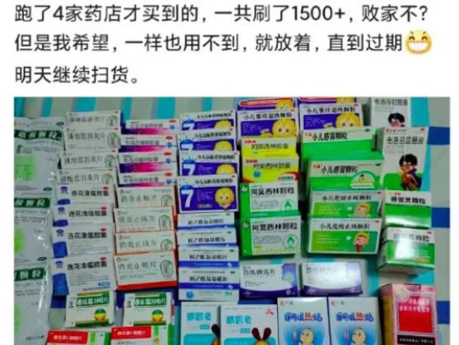 有的人,把药当菜买。一位90后家长晒出囤的1500元药品,跑了4家药店买下了枇杷露、布洛芬、消炎止咳片等种类药物超47盒,并洋洋自得地表示即使放到过期,也要继续扫货。
