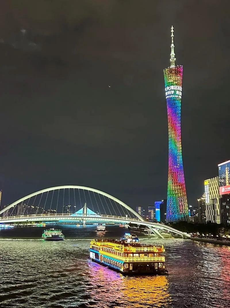 12. 珠江夜游:解锁广州夜景的最佳方式!乘船游览珠江,两岸璀璨灯光(广州塔、猎德大桥、沿江建筑群)尽收眼底,吹着江风很惬意。码头多,选离你近的就行。