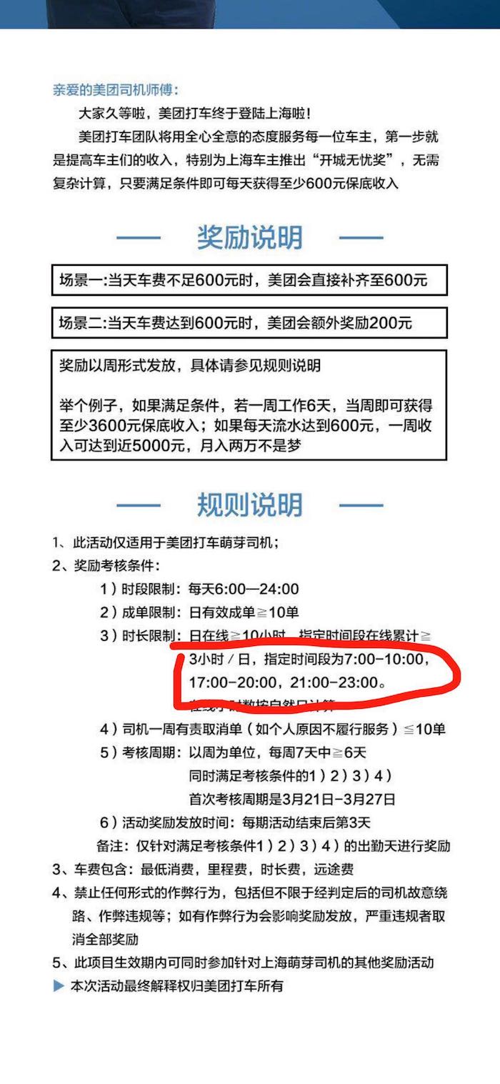 目前,美团打车的优惠是“上海开城无忧保障奖”,“日期从3月21日起,要求司机每天至少完成10单,且早上6点到晚上12点之间保证至少10小时在线,连续考核6天,取消订单最多十单,不刷单,不作弊,考核通过,就能获得如下优惠:每天(收入)不足600元,美团打车给补足到600元,超过600元,则再多奖励200元。”