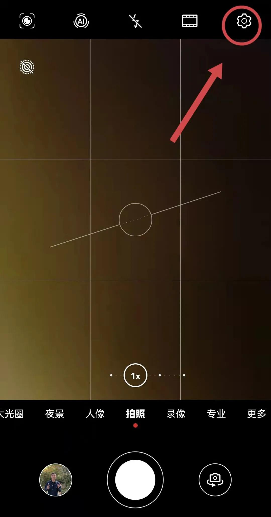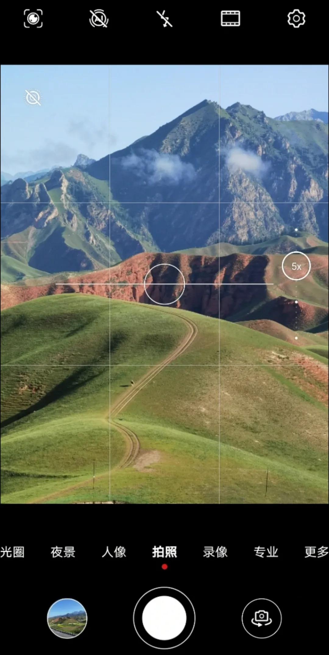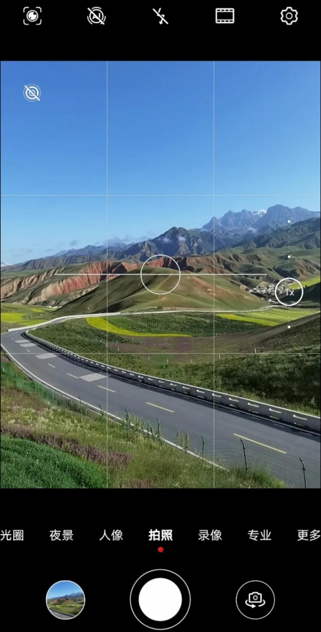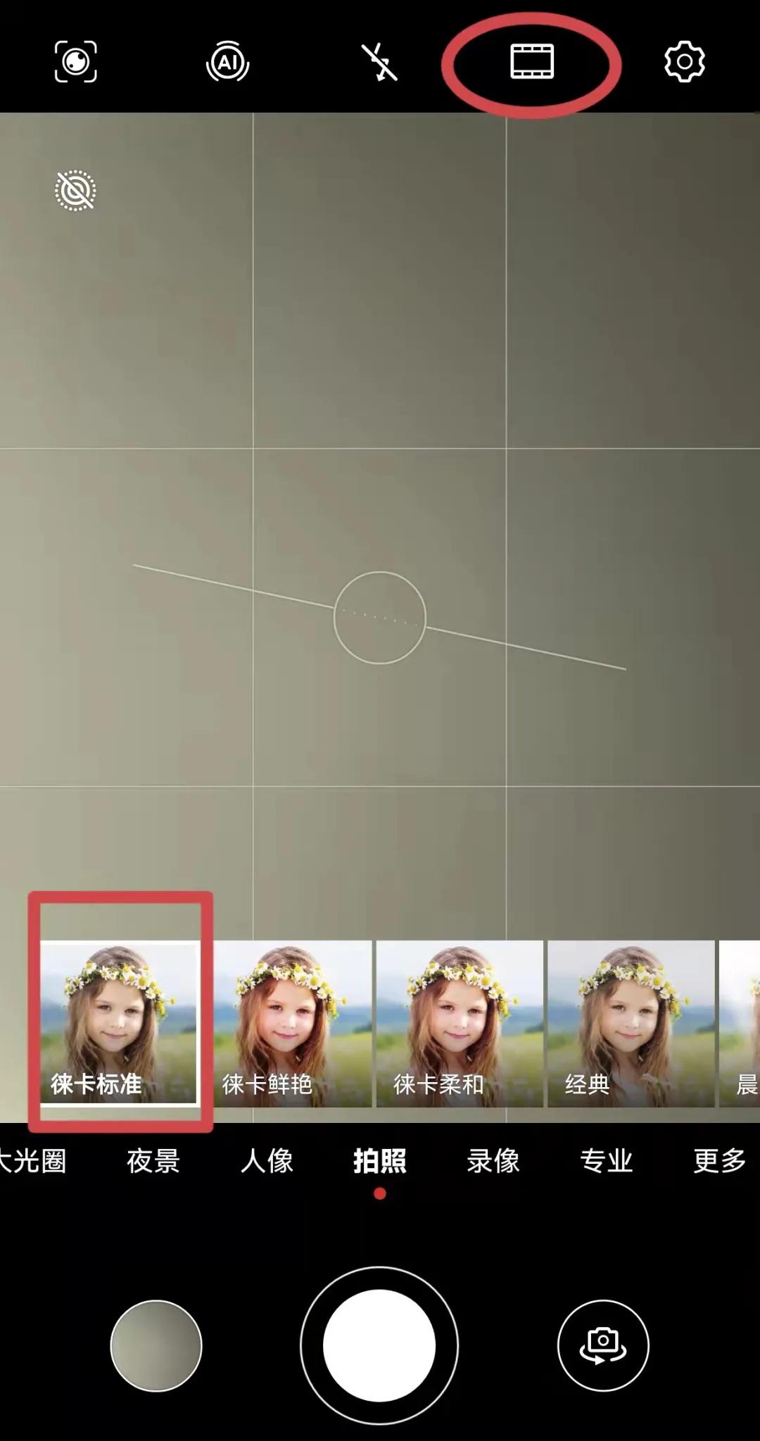 在拍摄界面的上方,是一些拍摄功能设置,由左到右分别是:智慧视觉(没啥用,不用管它)、AI摄影(平常要关掉)、闪光灯(通常关闭)、颜色模式、设置。