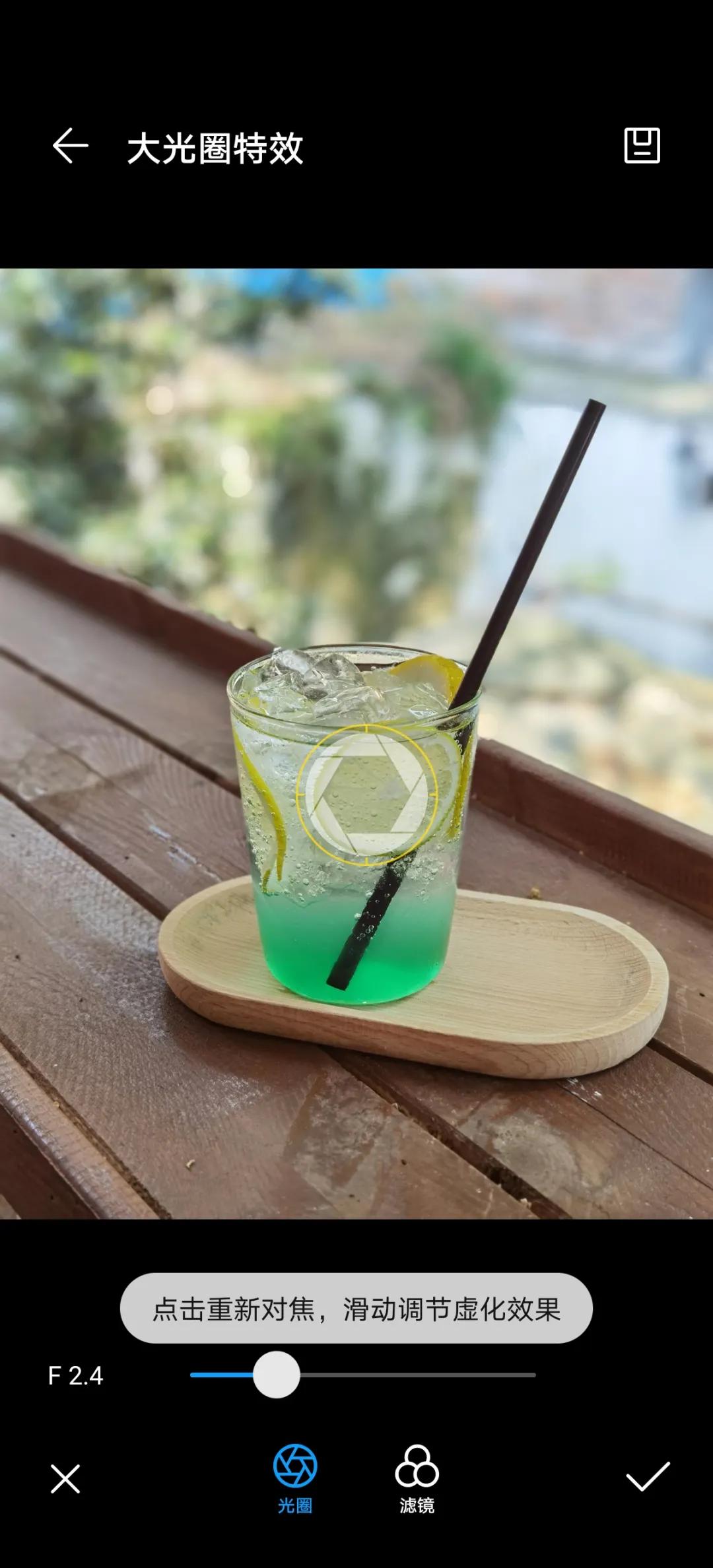 值得注意的是,使用大光圈模式拍摄完成后,在相册里还可以重新调整照片的虚化值和对焦点的位置:
