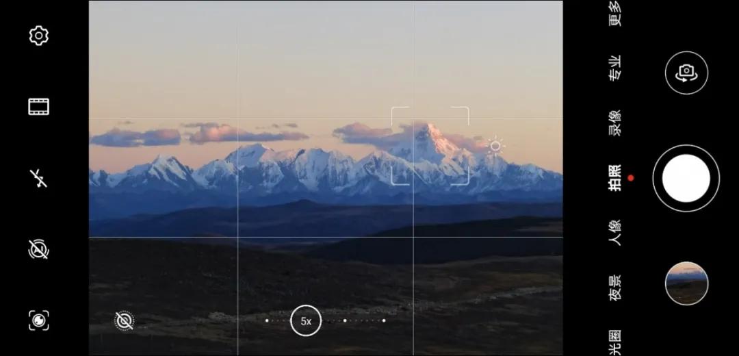 例如我们看下面这个雪山的拍摄场景,同一机位使用1X和5X拍摄到的画面构图是完全不同的: