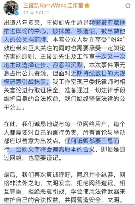 而王俊凯工作室也发文表示:这8年来一直被故意“抹黑、内涵”,