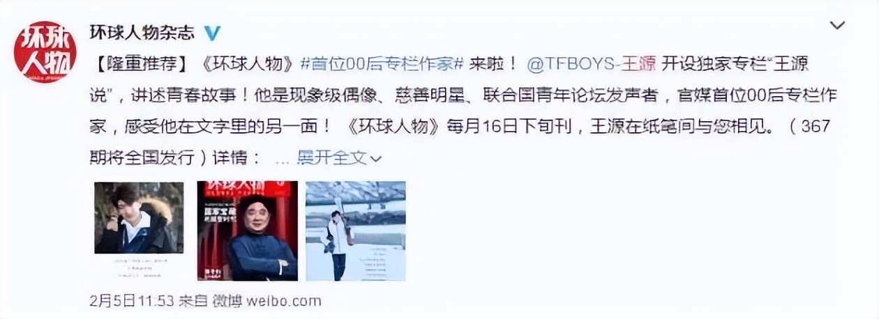 虽然公司给王源打造的是学渣人设,王源也因这被黑粉嘲了许多年,但鲜为人知的是,王源不仅是《环球人物》首位“00后专栏作家”,