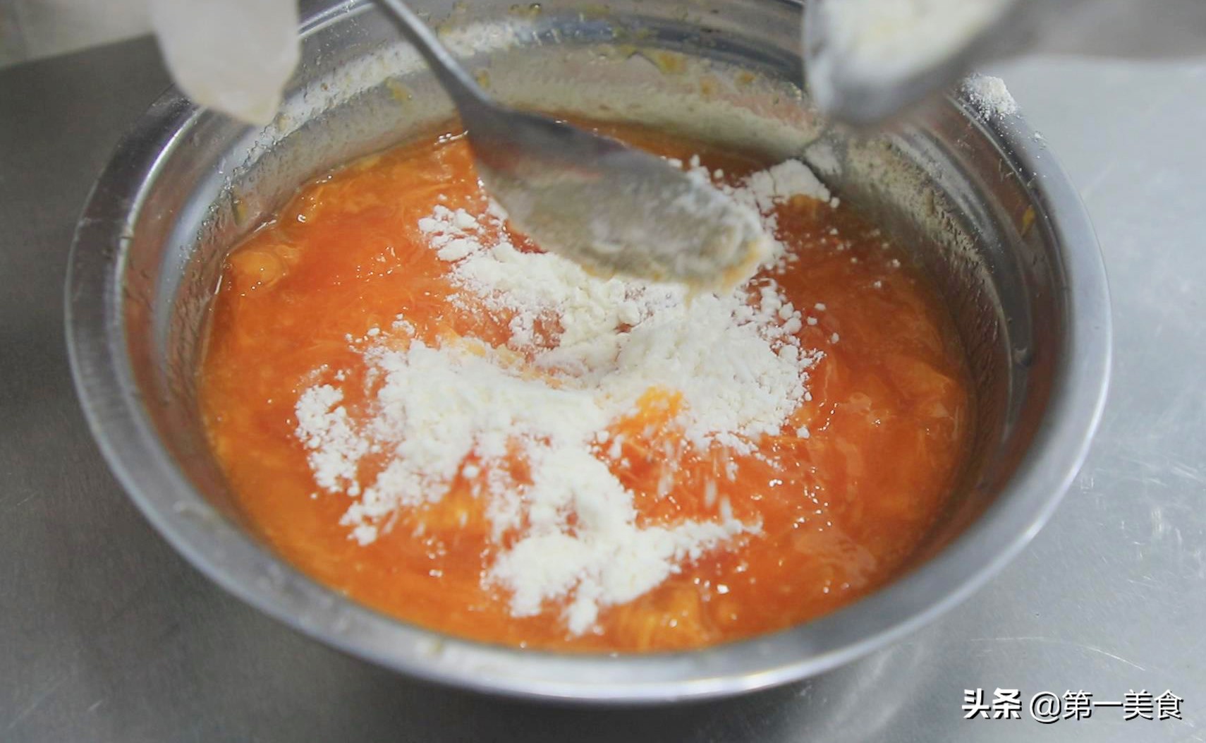 倒面粉时最好用勺子搅着,能搅成柿子糊就可以了。和成面团吃的全是面粉了,没有柿子的香甜了。